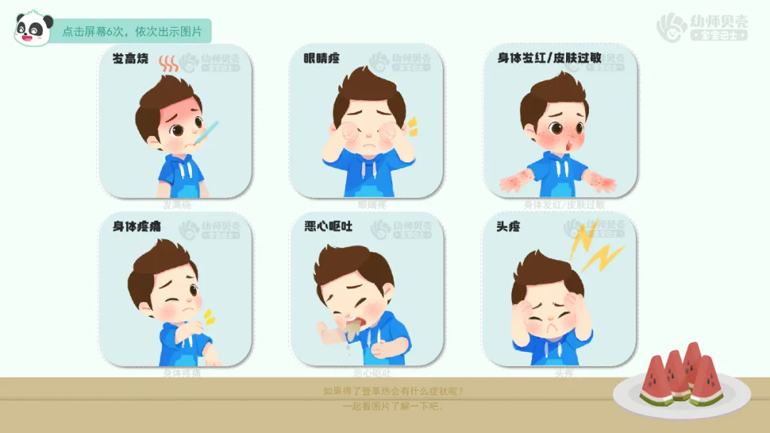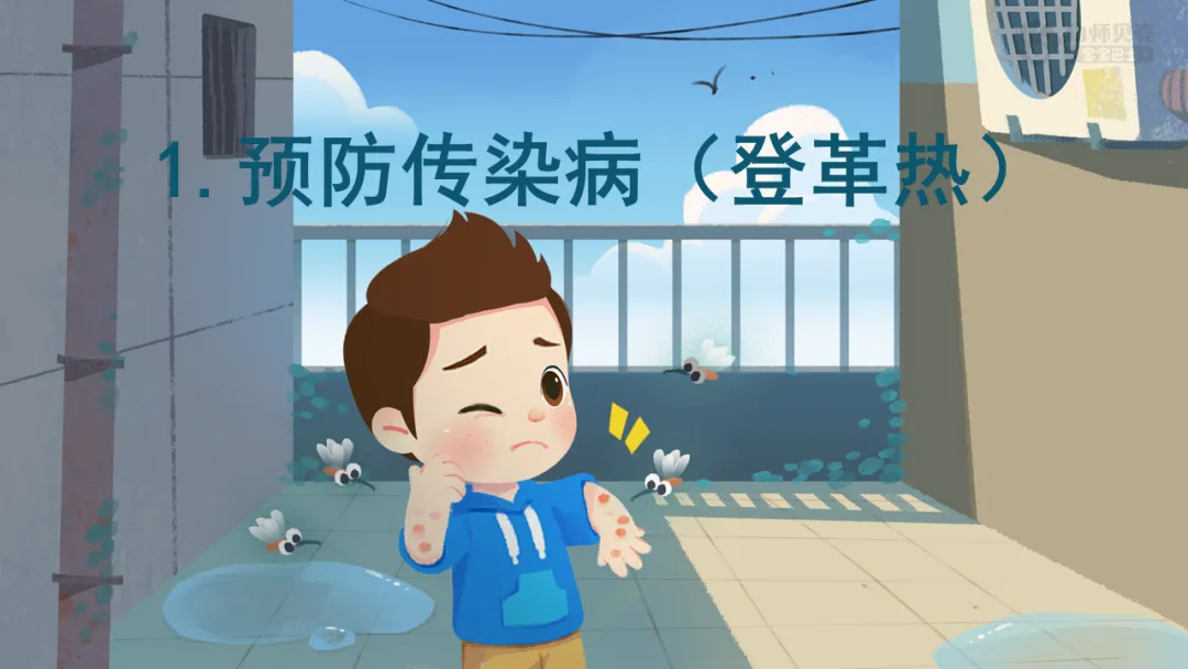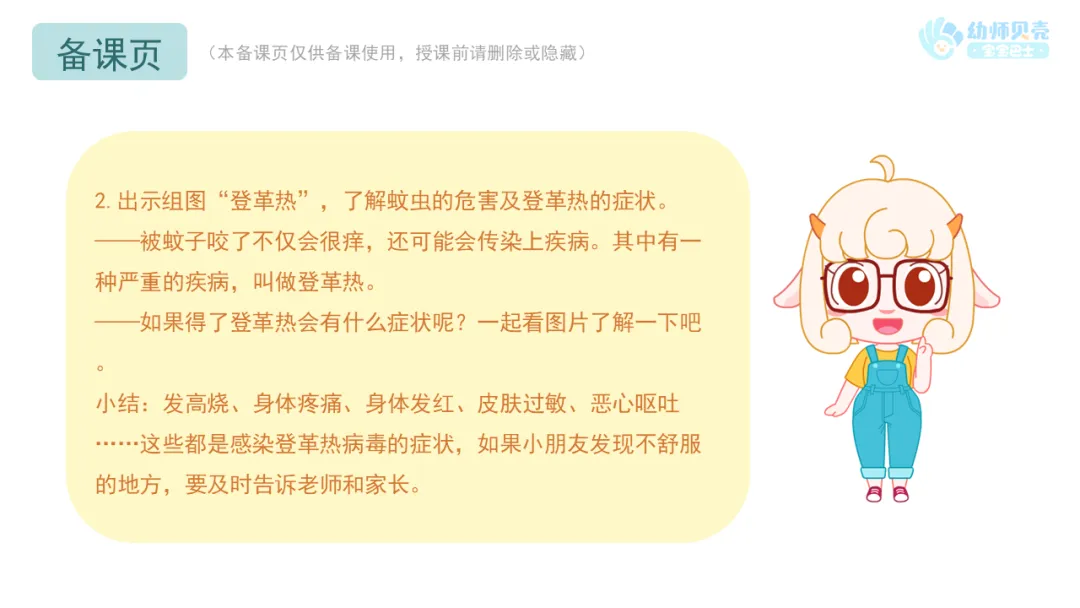 小结:发高烧、身体疼痛、身体发红、皮肤过敏、恶心呕吐……这些都是感染登革热病毒的症状,如果小朋友发现不舒服的地方,要及时告诉老师和家长。