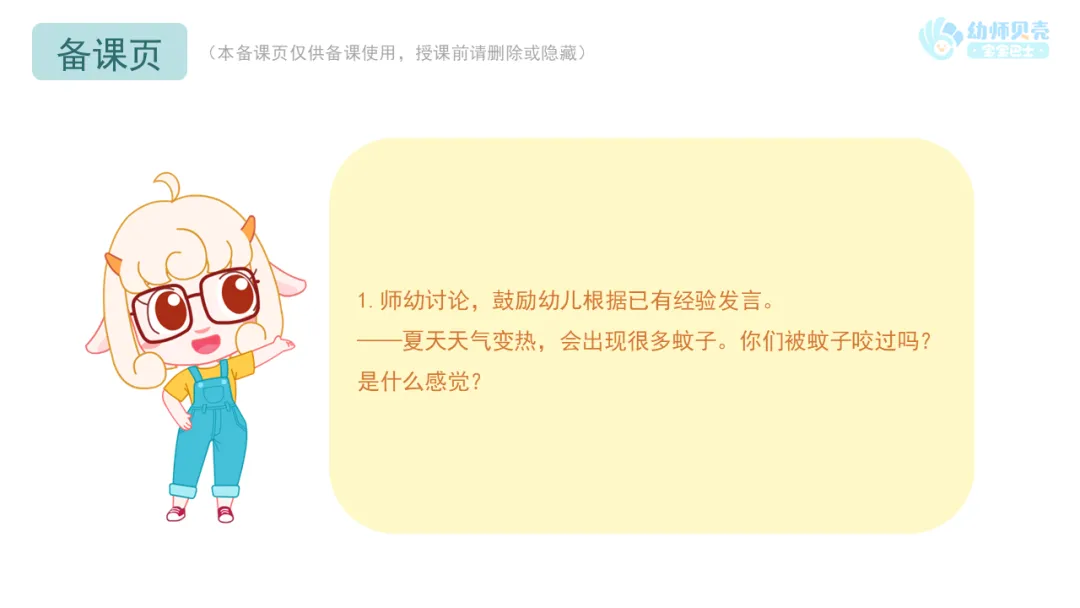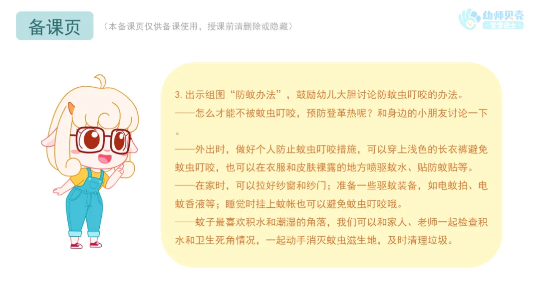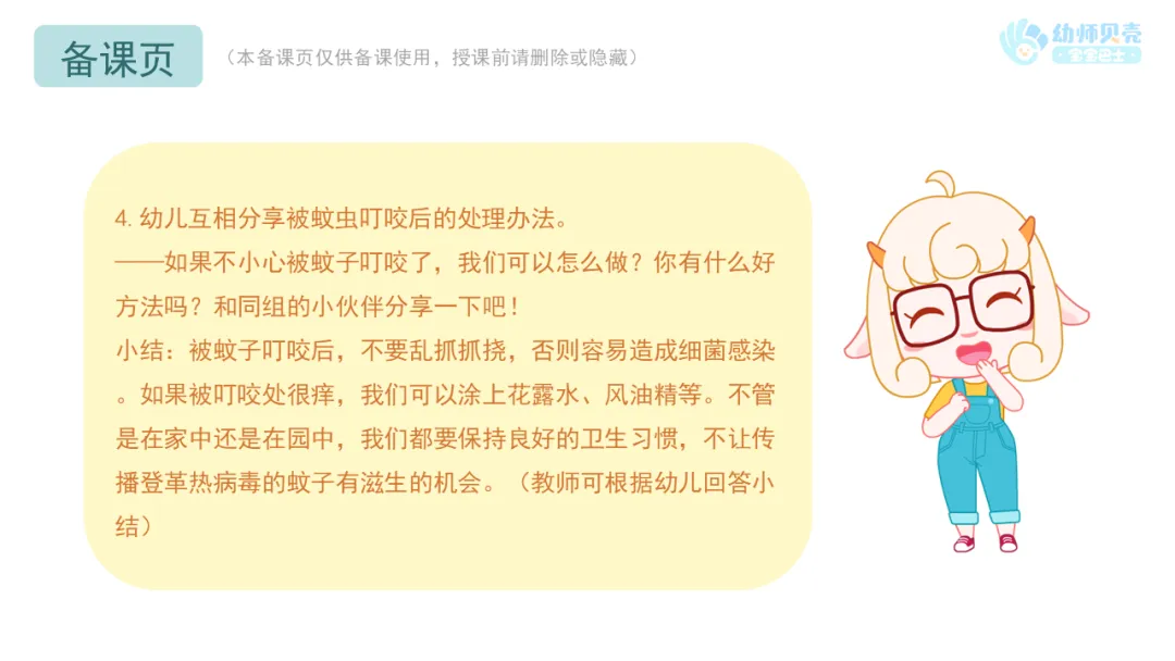 l活动要点:教师可从防蚊办法、被蚊虫叮咬后的处理办法两方面请幼儿展开谈话,鼓励幼儿完整表达自己的想法。