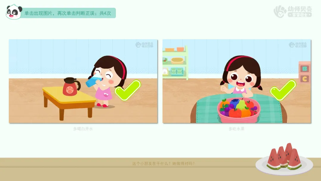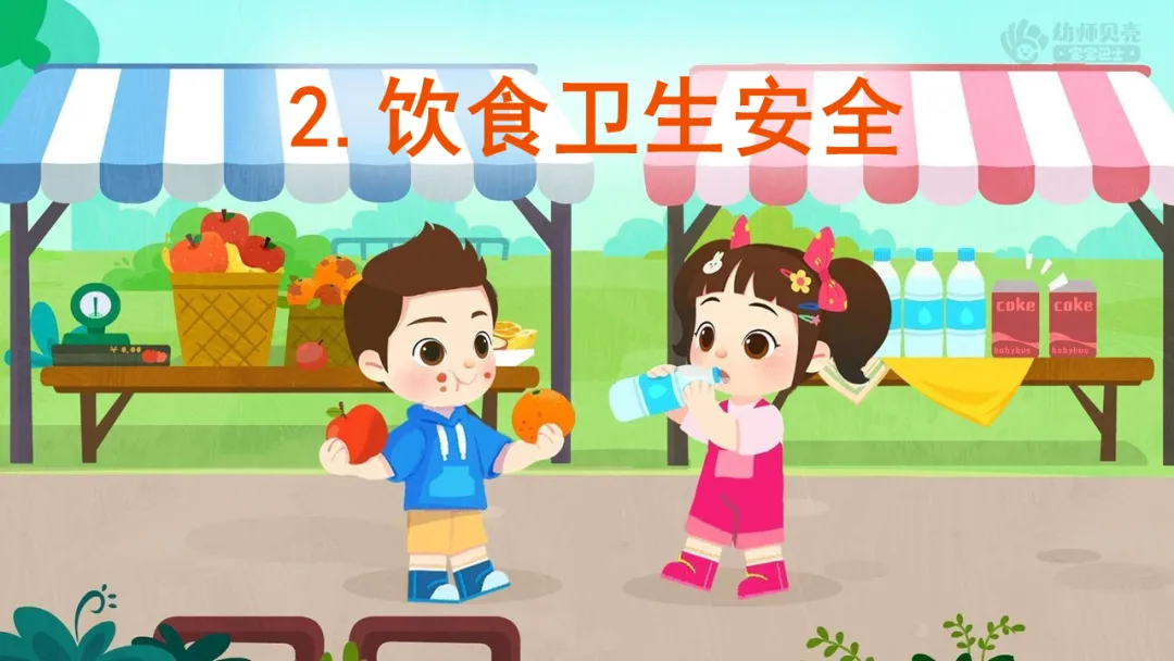 小结:夏季气温高,细菌活跃,切开的水果在室温下容易腐坏,应该选择干净完整新鲜的水果。口渴时,最好喝凉开水、矿泉水,小朋友不能喝碳酸饮料哦。