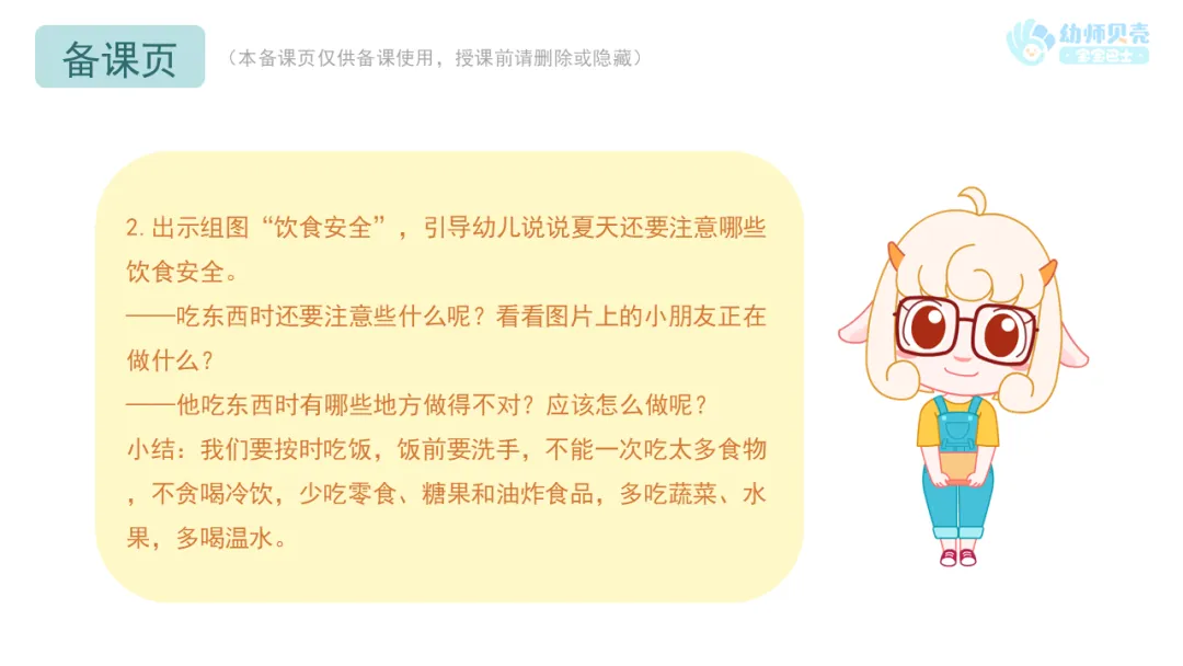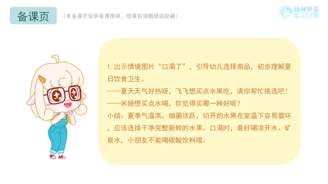 l活动要点:教师可从夏天的解暑食物导入活动,鼓励幼儿根据已有经验,围绕夏季饮食安全展开讨论。