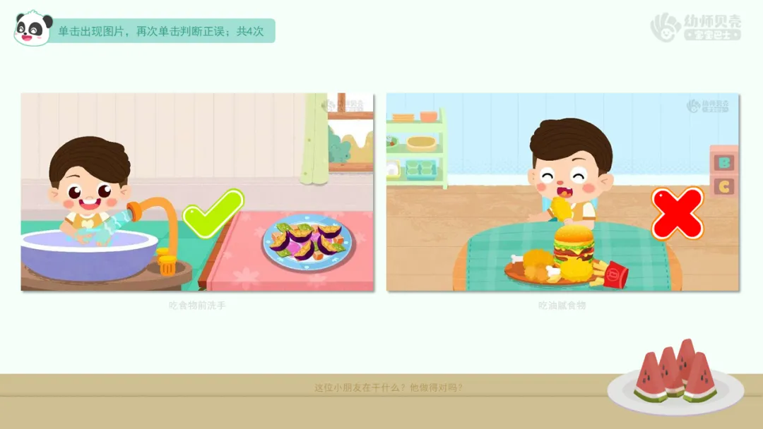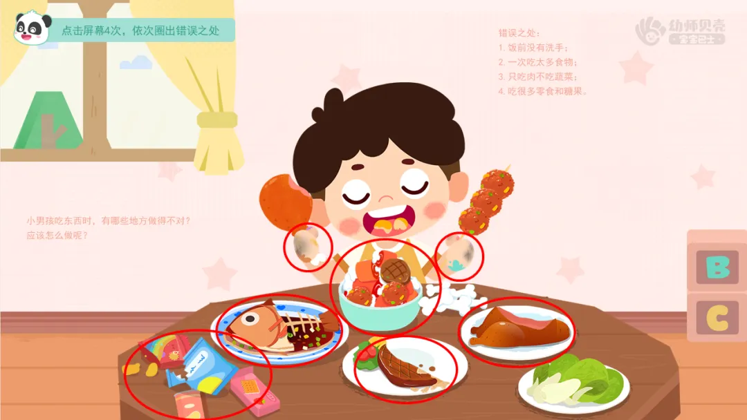 ——他吃东西时有哪些地方做得不对?应该怎么做呢?