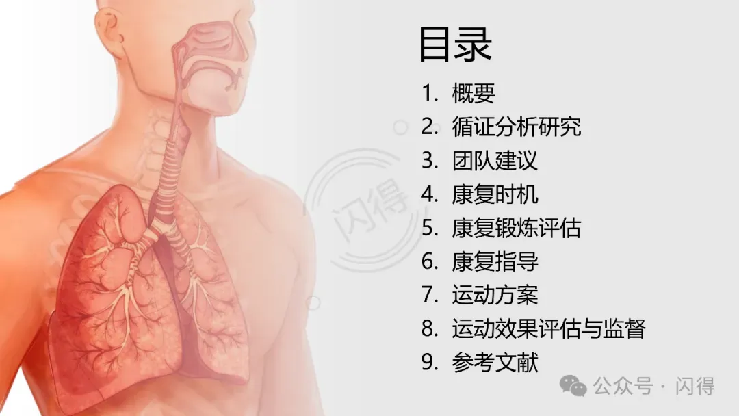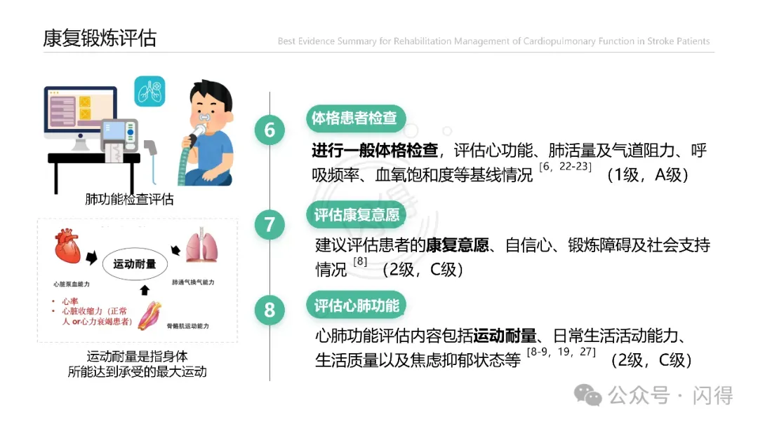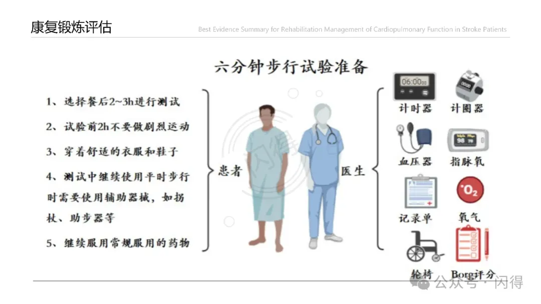 康复评估:涵盖体格检查(心功能、肺活量等)、康复意愿、运动耐量(首选6分钟步行试验)及心理状态。
