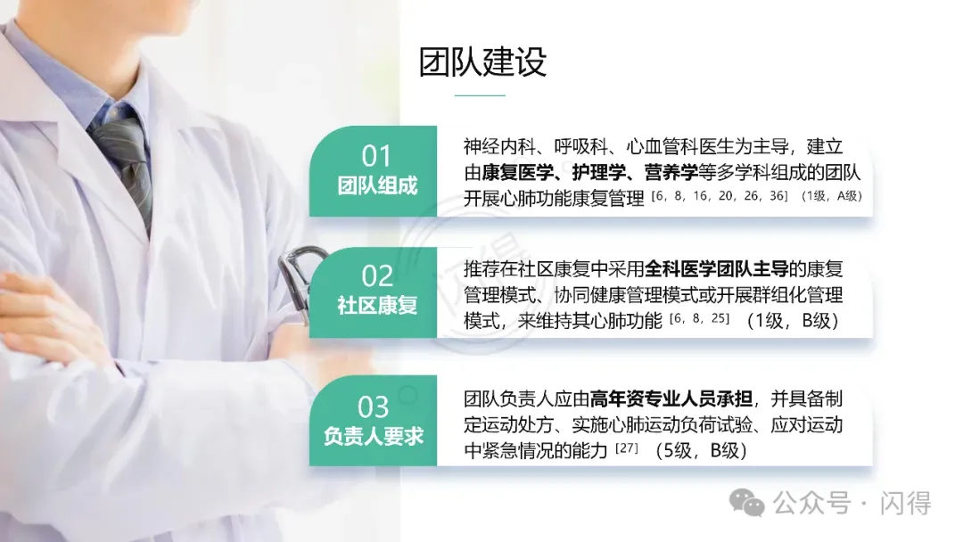 团队建设:以神经内科、呼吸科、心血管科医生为主导,康复、护理、营养多学科协作,社区可采用全科团队或群组化管理