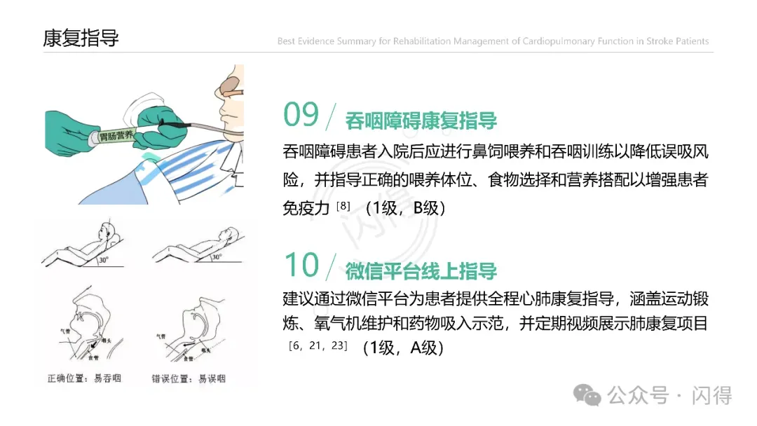 康复指导:膳食推荐碳水50%~65%、脂肪20%~30%、蛋白质15%~20%;气管切开患者需预防误吸,吞咽障碍者尽早鼻饲及吞咽训练;可通过微信平台等互联网工具远程指导。