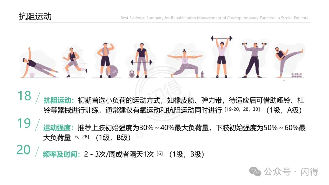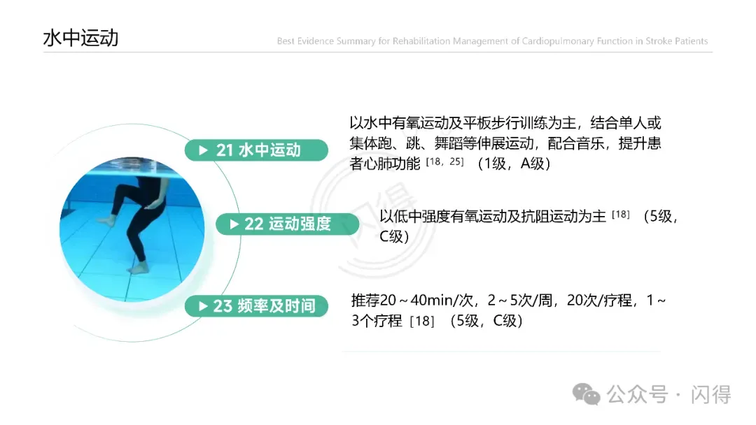 抗阻/水中运动:初期小负荷(橡皮筋),水中以上肢30%~40%、下肢50%~60%最大负荷开始;