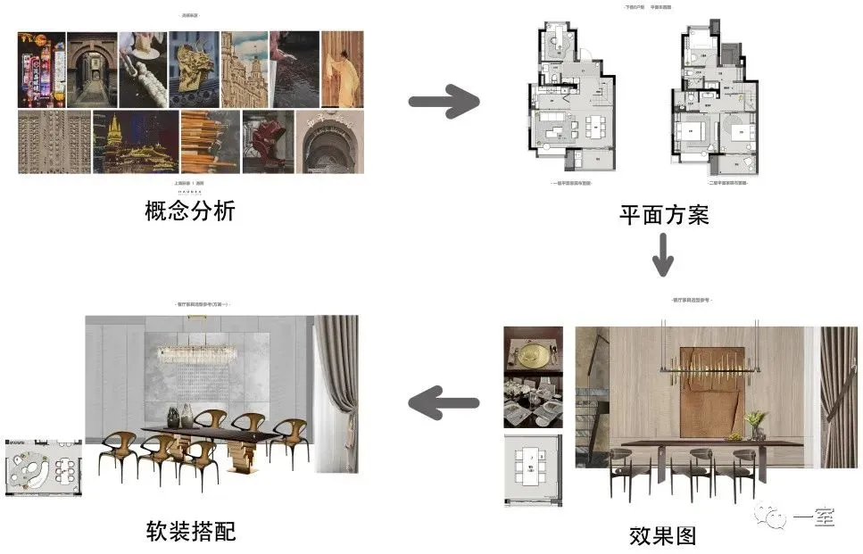 一个PPT内容较多,就需要有清晰的逻辑,不能乱七八糟,让人无法理解。样板间的方案汇报PPT,一般从概念分析、平面方案到意向图、效果图、软装物料等,层层递进。