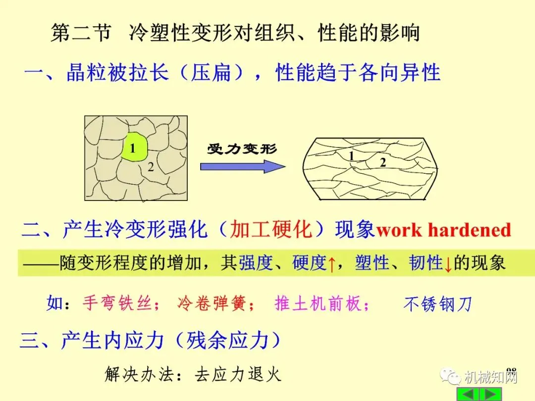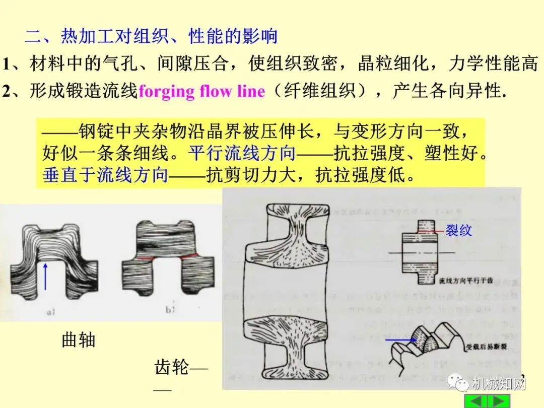 其次是塑性加工(锻压),包括自由锻、模锻和板料冲压等。其核心是金属的塑性变形,该过程会改变金属的组织和性能。冷变形会导致加工硬化,而热变形则伴随着再结晶过程。锻造形成的流线组织使金属性能呈各向异性,对零件的力学性能有重要影响。