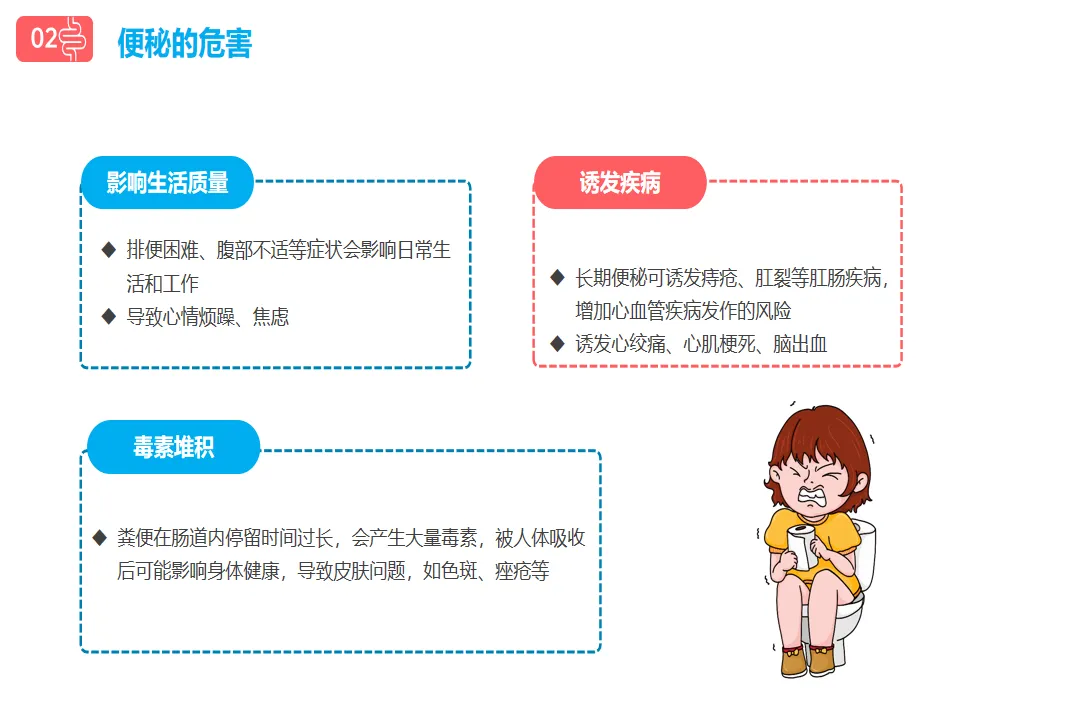 从危害上看,便秘不仅会导致痔疮、肛裂,还会让毒素堆积,引起色斑、口臭,甚至诱发心绞痛、脑出血;从病因上看,久坐不动、喝水太少、膳食纤维摄入不足、精神压力大,这些生活习惯都是便秘的“罪魁祸首”。