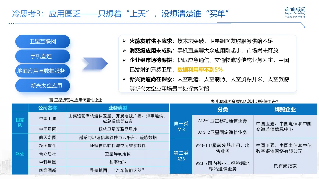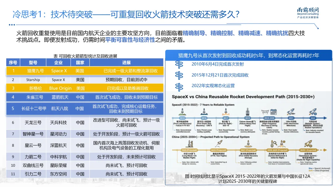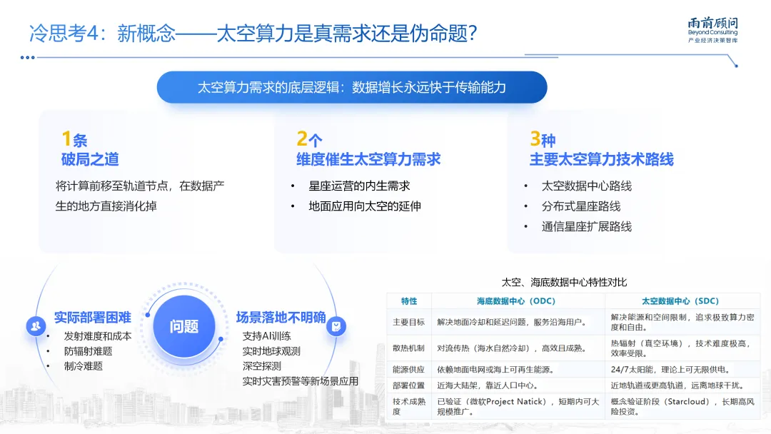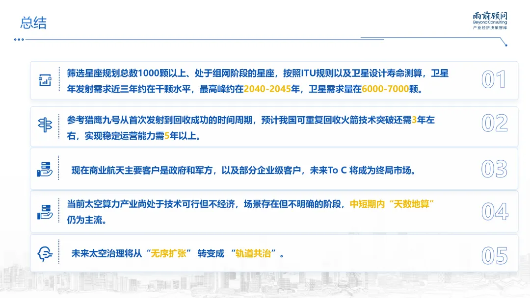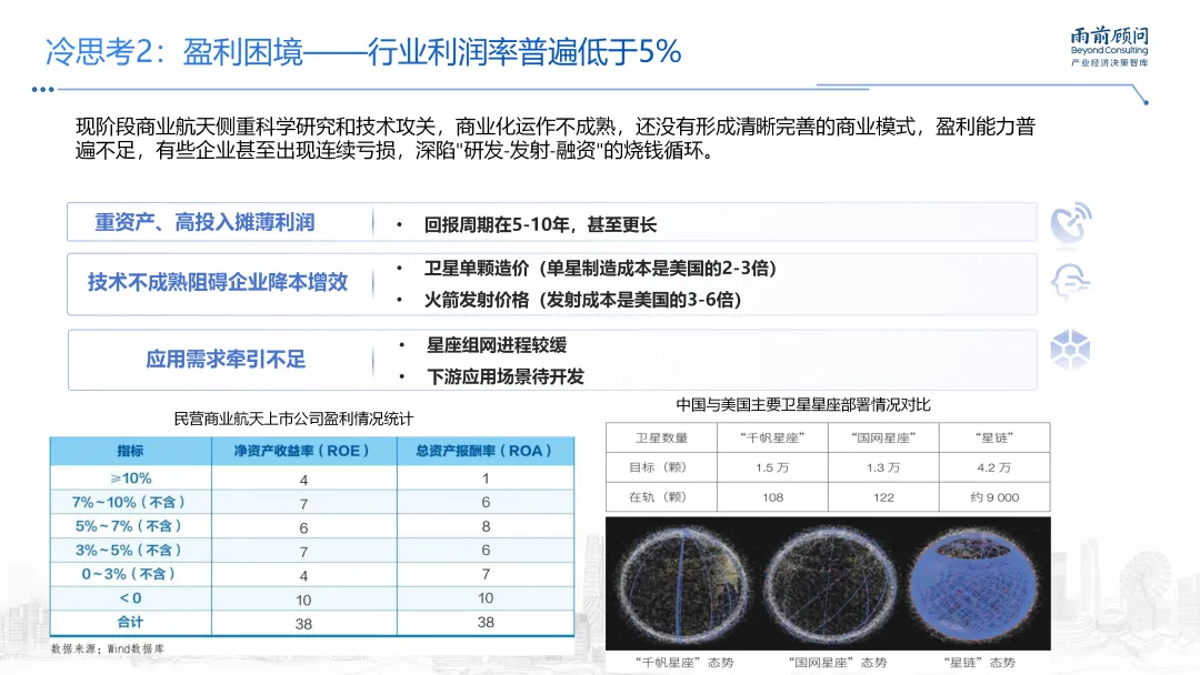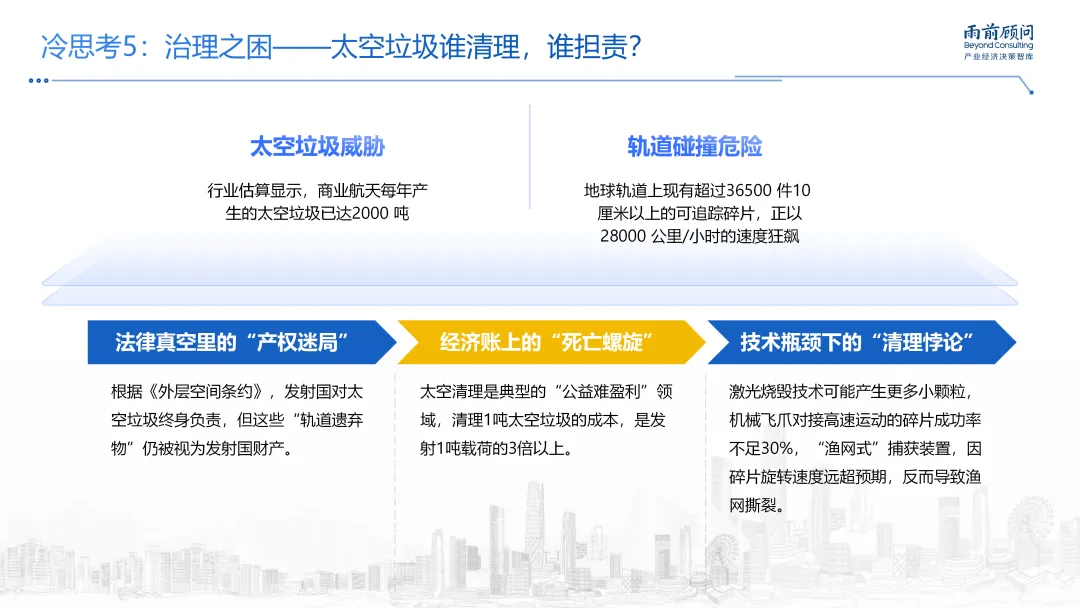 然而,热潮之下尤需冷思考,产业发展仍面临五大核心挑战:一是技术待突破,可重复回收火箭仍需攻克“精确制导、控制、减速、抗扰”四大难关;二是盈利困境,行业深陷“研发-发射-融资”的烧钱循环,利润率普遍低于5%;三是应用匮乏,消费级市场如手机直连尚未成熟,遥感数据利用率不足5%;四是新概念虚实,太空算力面临成本与场景难题,中短期内“天数地算”仍是主流;五是治理之困,太空垃圾年增约2000吨,清理存在“清理悖论”,“轨道共治”体系亟待构建。