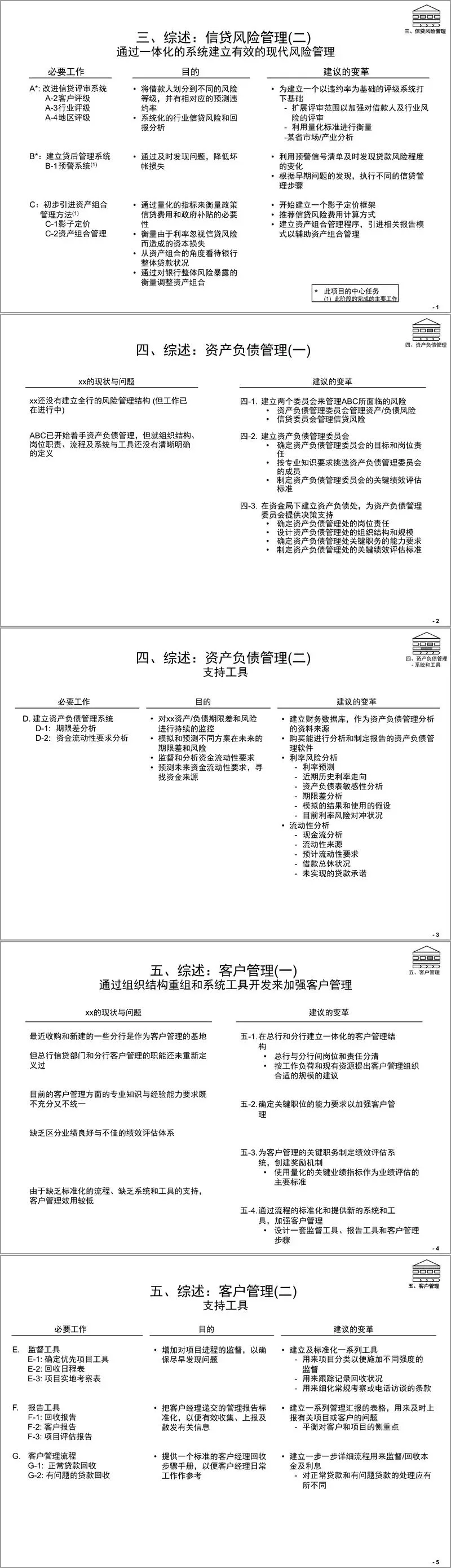 信贷风险管理存在职能分散、审批流程重复、贷委会效率低等问题。方案将建立中央信贷风险管理职能部门,改革审批流程,重新定位贷委会,明确关键岗位能力要求,引入量化考核指标,同时搭建客户评级、行业评级、预警系统等一体化管理系统。