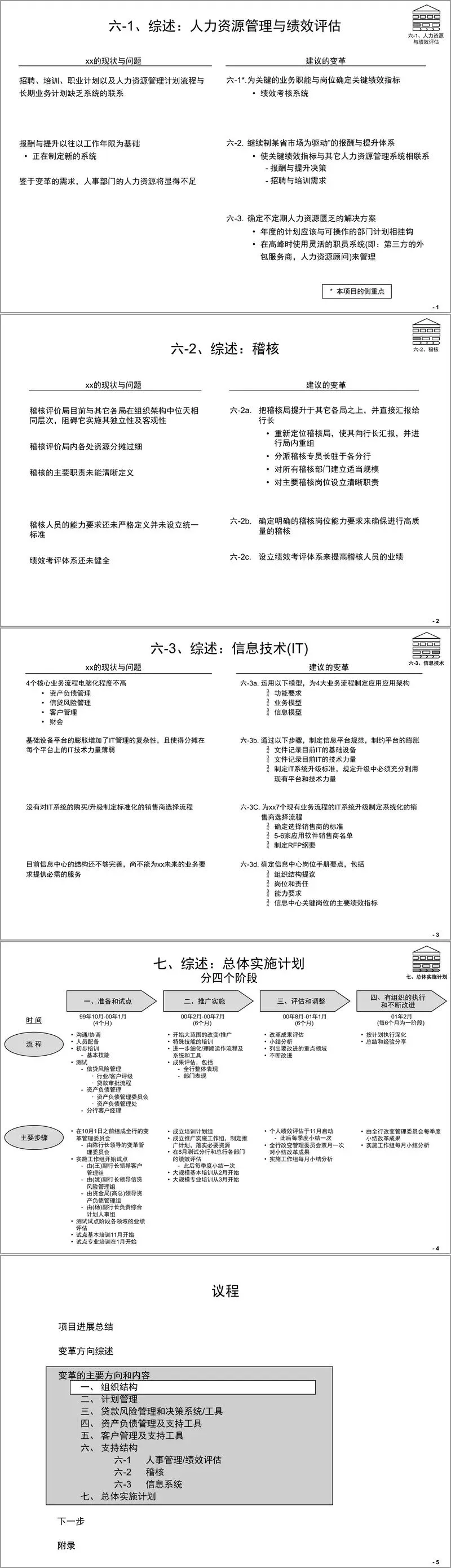 总体实施计划分为准备和试点、推广实施、评估和调整、执行与改进四个阶段,明确各阶段时间节点、核心任务、人员配备及培训安排,同时梳理了各核心领域的项目进展与阶段目标。