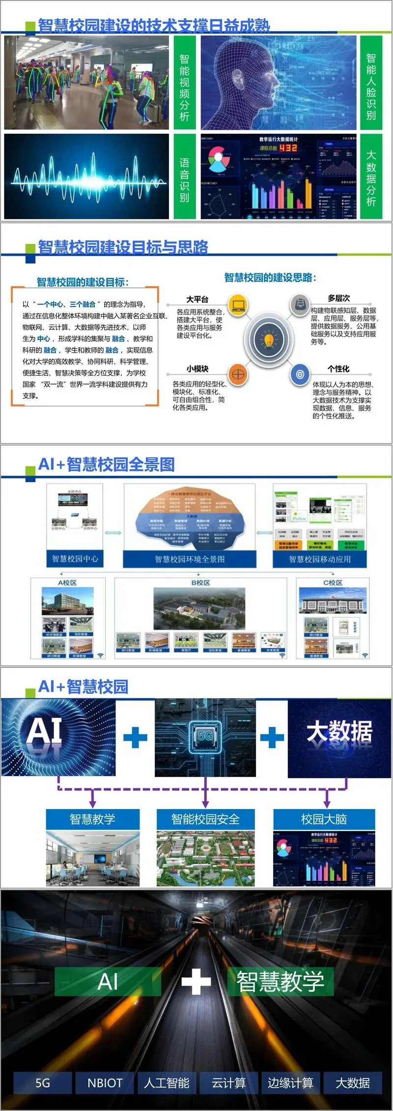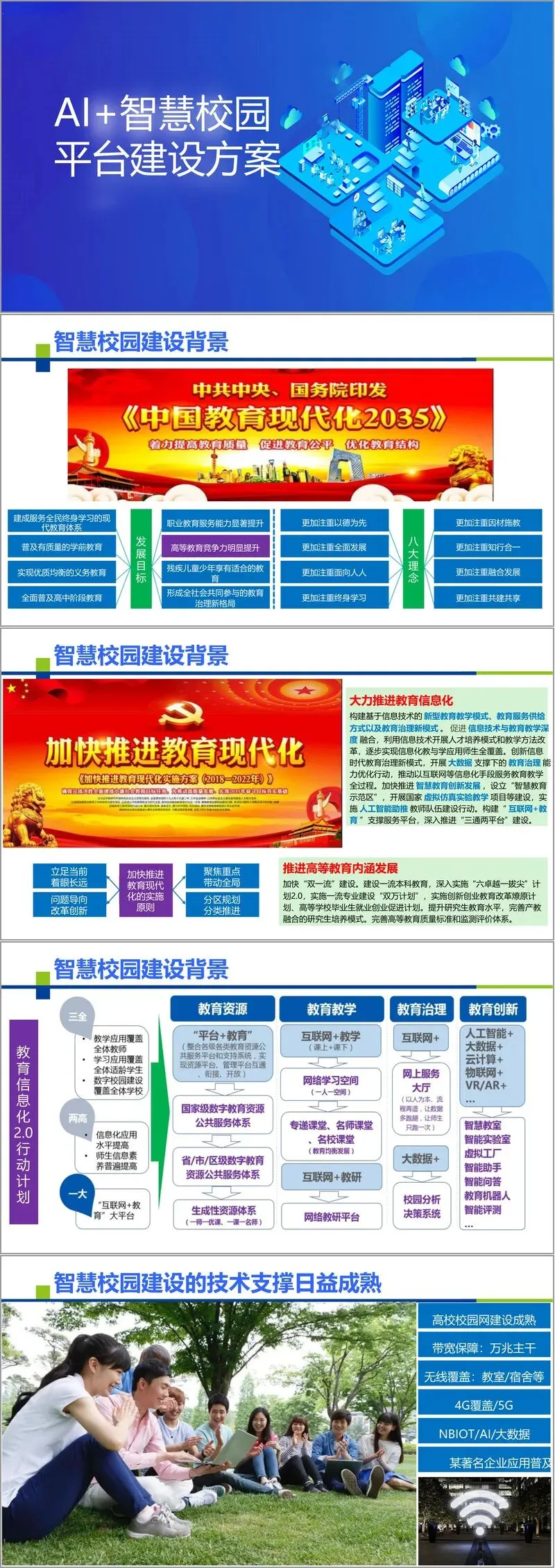 在教育现代化进程不断加速的今天,“AI+智慧校园”已成为推动教育高质量发展的重要引擎。该建设方案以国家教育发展战略为引领,深度融合人工智能、大数据、云计算、物联网等前沿技术,旨在构建一个智能化、个性化、协同化的新型教育环境。其核心目标在于通过技术赋能,实现高效教学、协同科研、科学管理与便捷生活,最终形成支撑全民终身学习的现代教育体系。
