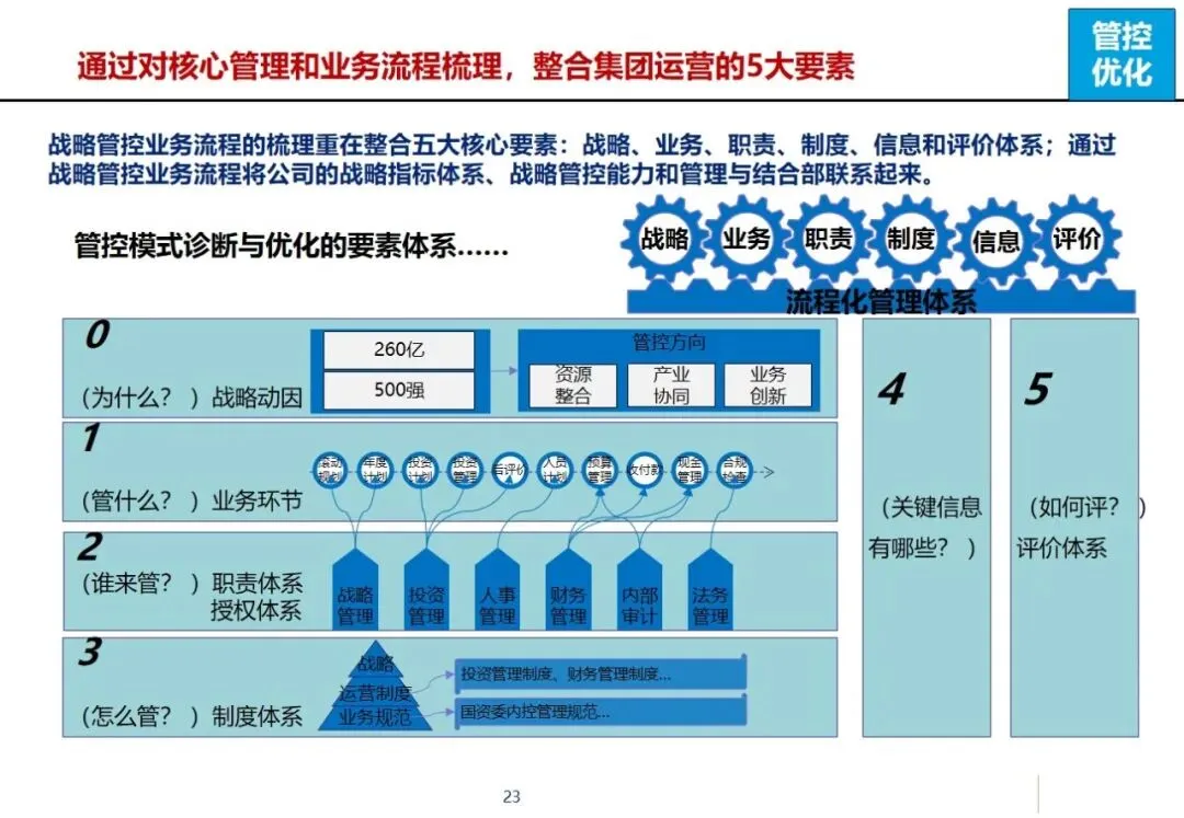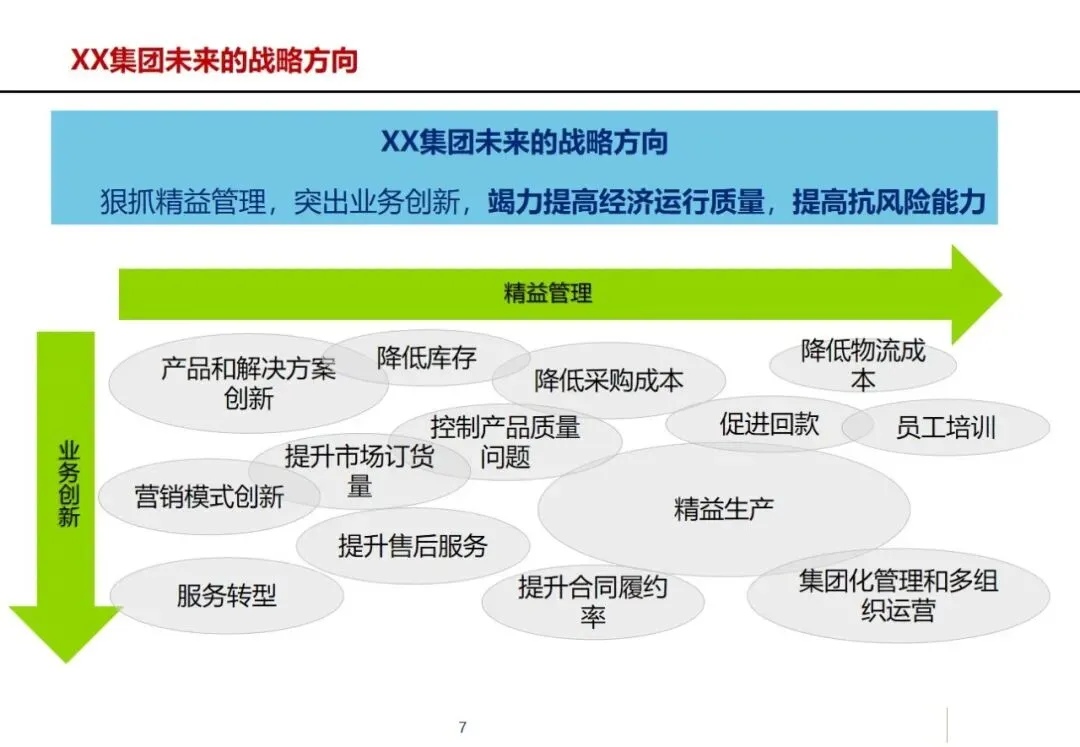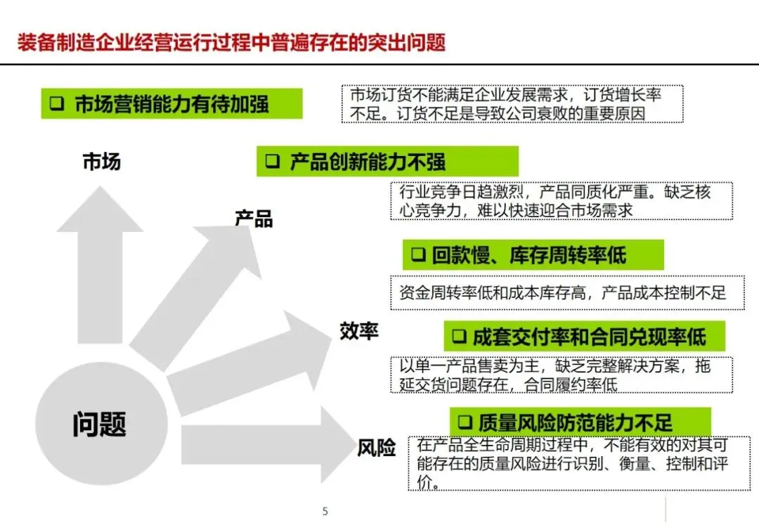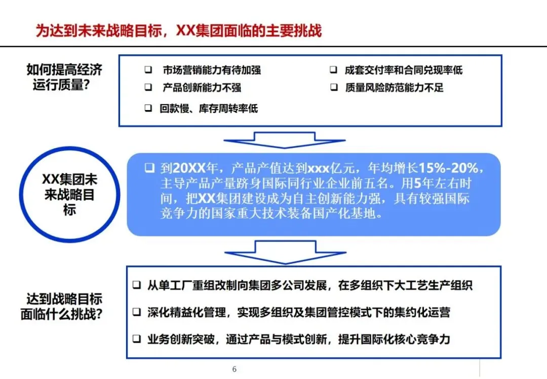方案以行业成熟的方法论和工具为基础,以流程管理为核心,将战略、运营、责任等核心因素有机结合,促进组织、制度和系统的全面整合,为集团实现年平均产值15%~20%的增长、主导产品进入全球前五强、成为具有较强自主创新能力和较强抗风险能力的现代化设备制造企业等战略目标奠定基础。