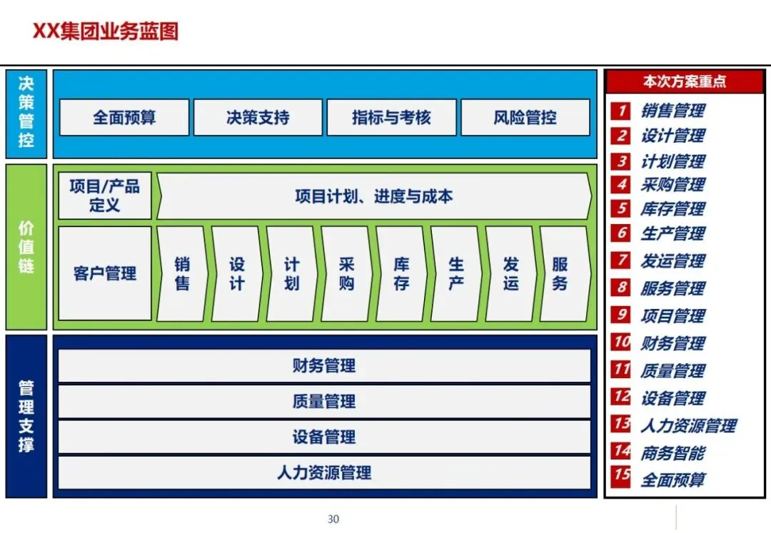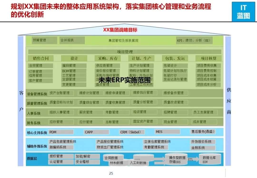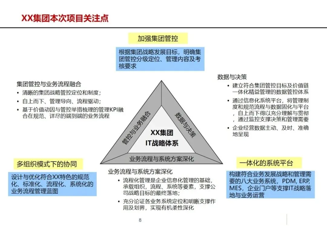 XX集团ERP升级改造项目是基于设备制造业的行业特征和集团的战略发展需要,为帮助集团实现由单一企业到多组织的集团化转变,为进一步深化精益化管理,提高国际竞争力,建立“有效管控、顺畅协同、数据驱动”的集成化运作系统而进行的IT咨询和整体规划。