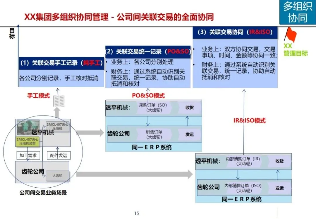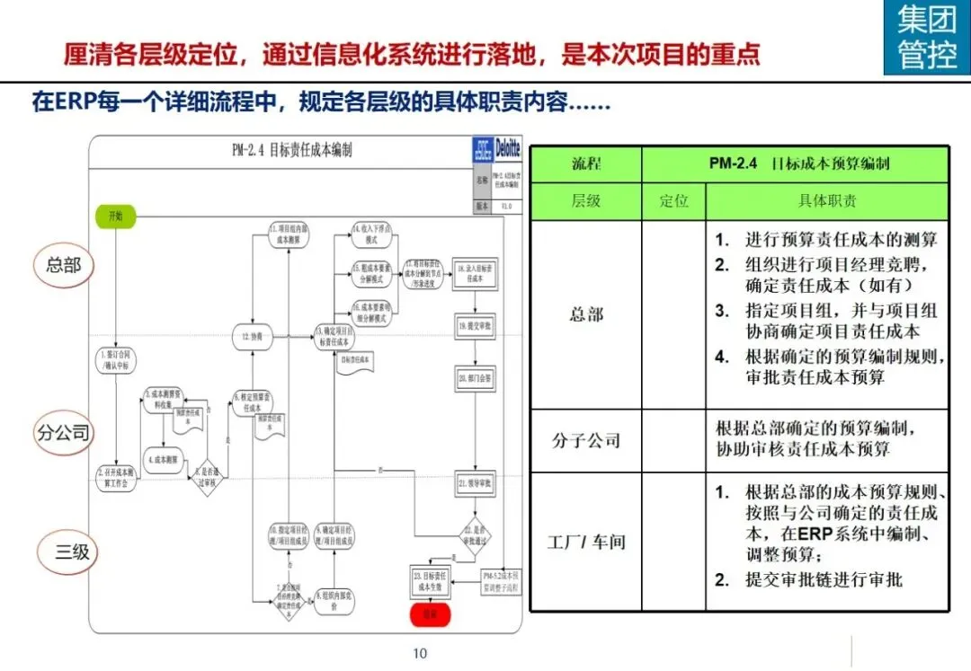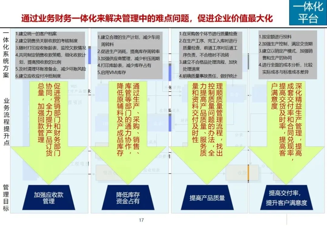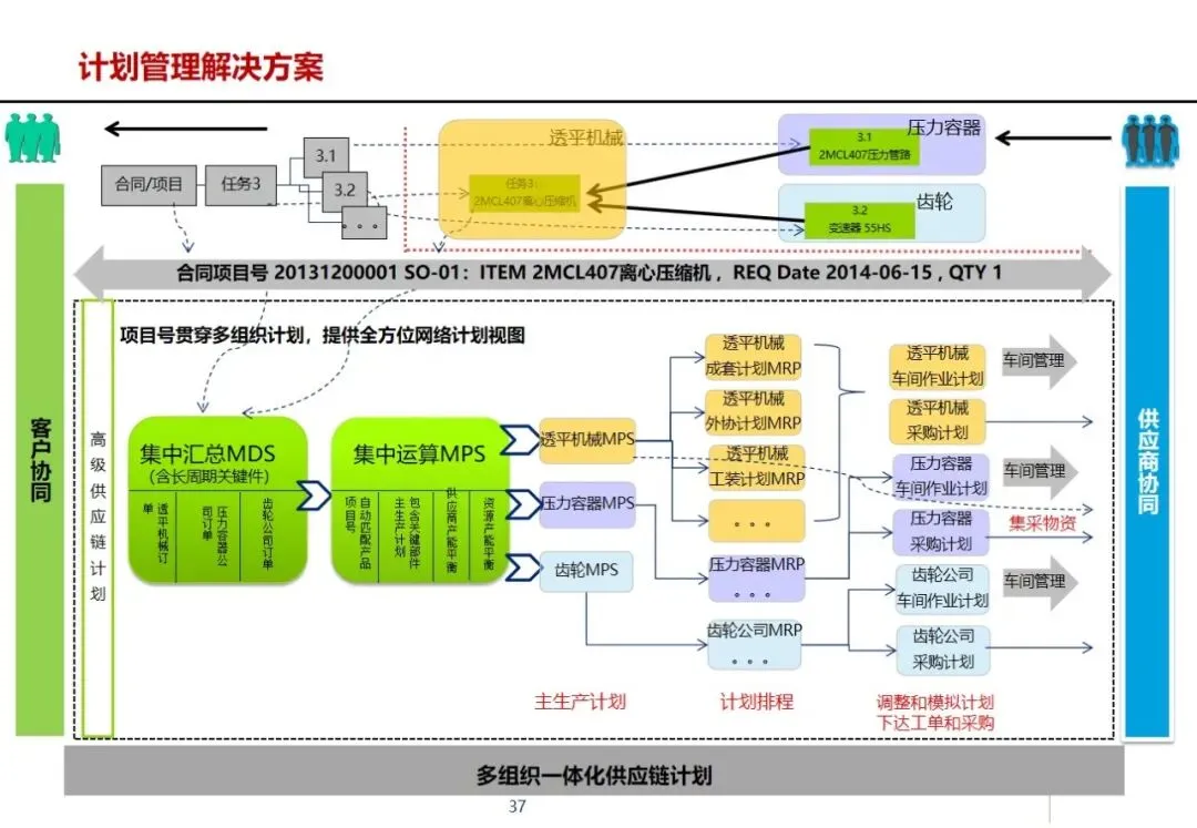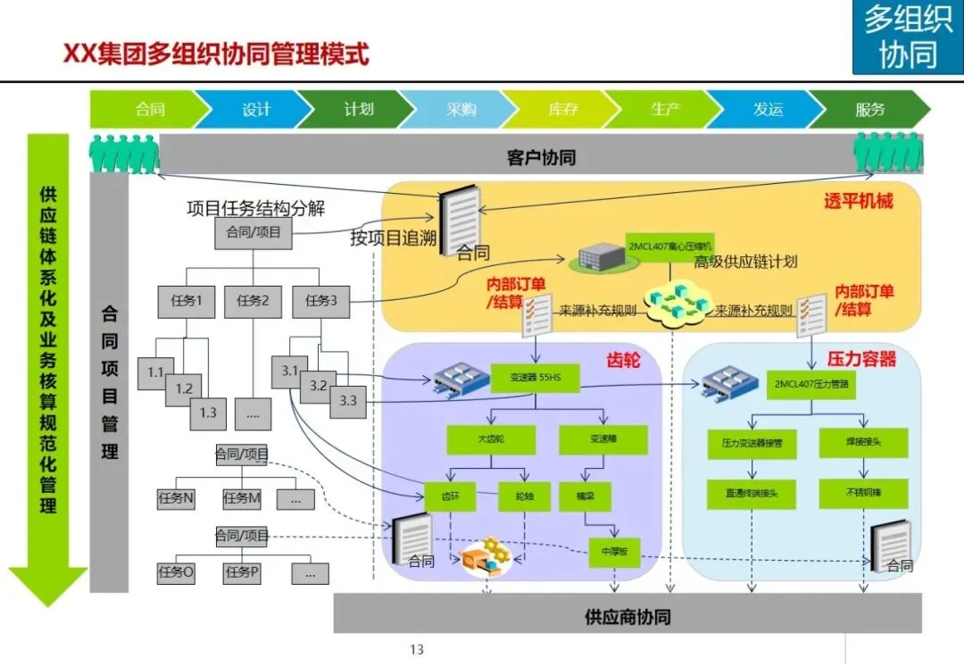 方案针对集团营销能力有待提升,产品创新不足,回款和库存周转缓慢,成套交付率和合同履约率低,质量风险防范能力差等突出问题,提出了加强集团内部控制,优化多部门协同,建立综合信息平台的工作重点。在控制层面上,运用战略控制模式,明确了集团、子公司和工厂的功能定位和 ERP系统的作用,通过分解预算、规范制度和绩效管理来保证战略的实施;协同层面,构建集中式与分布式生产计划模式,使企业之间的关联交易达到完全的协同,消除企业内部的业务障碍。