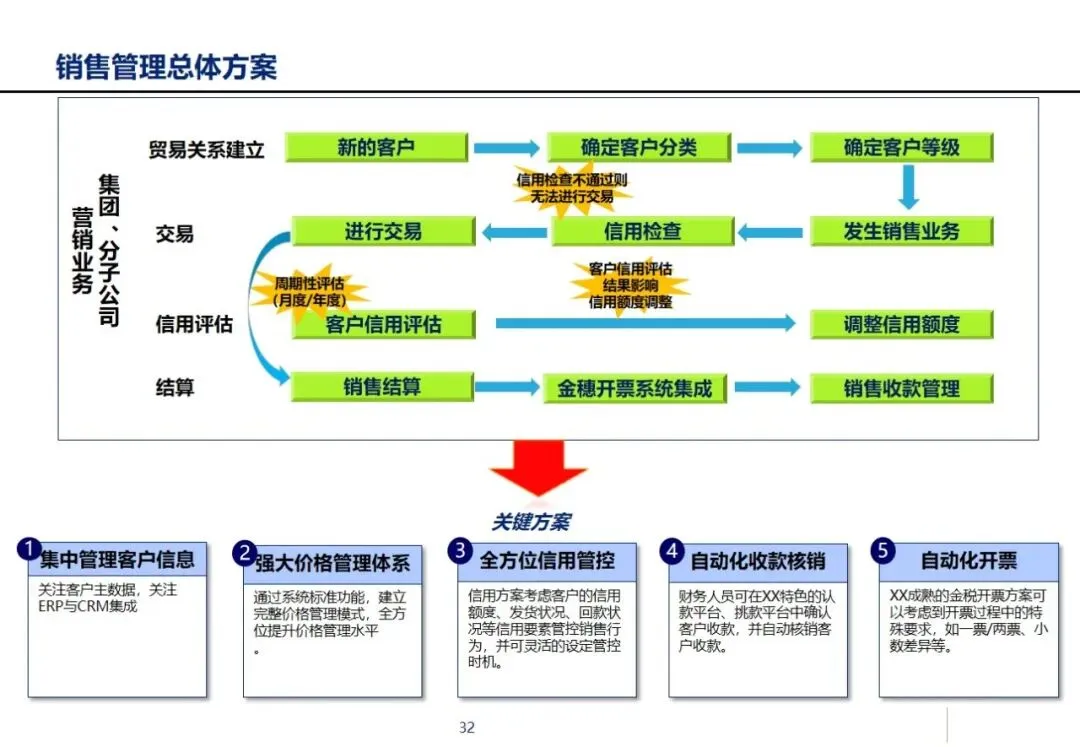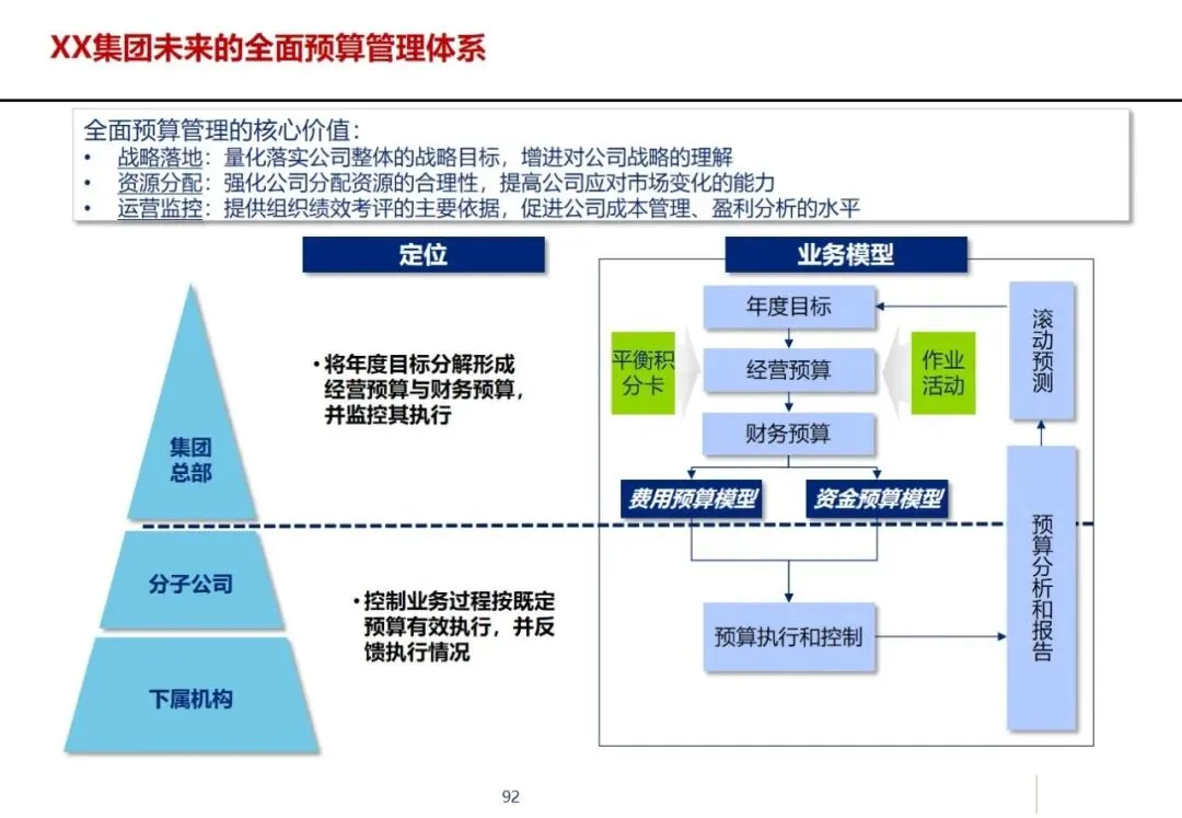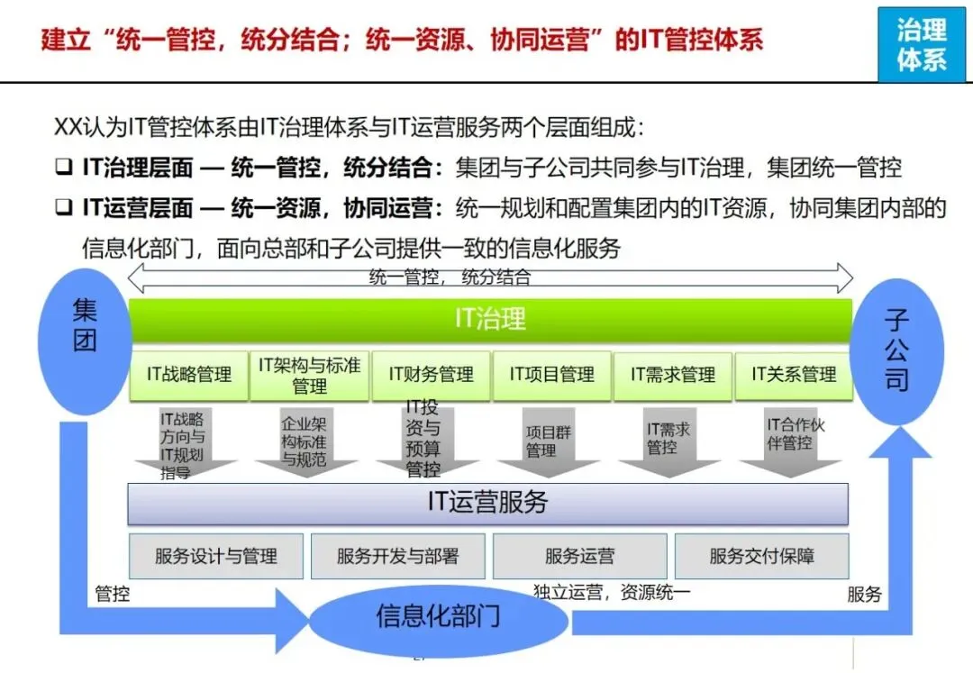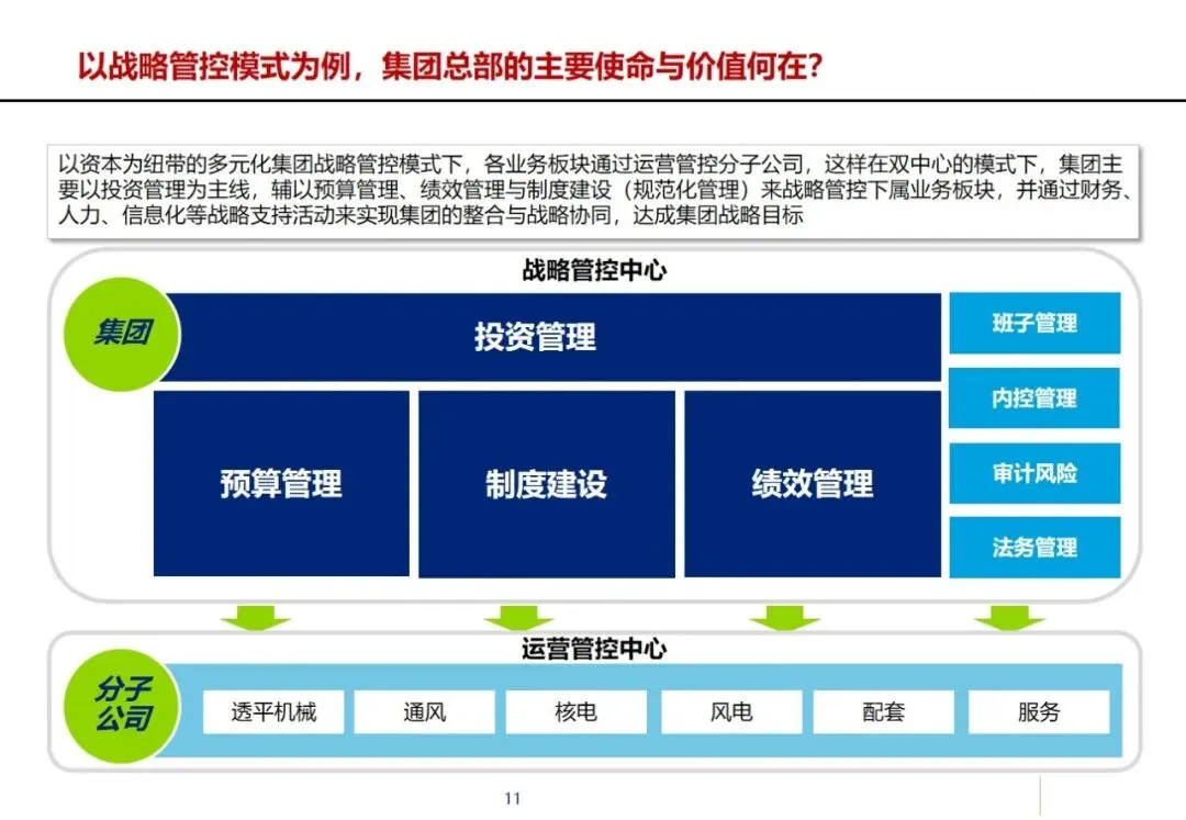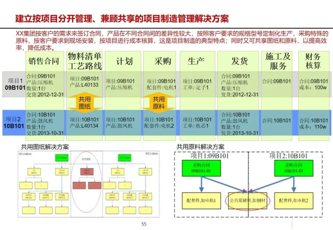 方案针对集团营销能力有待提升,产品创新不足,回款和库存周转缓慢,成套交付率和合同履约率低,质量风险防范能力差等突出问题,提出了加强集团内部控制,优化多部门协同,建立综合信息平台的工作重点。在控制层面上,运用战略控制模式,明确了集团、子公司和工厂的功能定位和 ERP系统的作用,通过分解预算、规范制度和绩效管理来保证战略的实施;协同层面,构建集中式与分布式生产计划模式,使企业之间的关联交易达到完全的协同,消除企业内部的业务障碍。