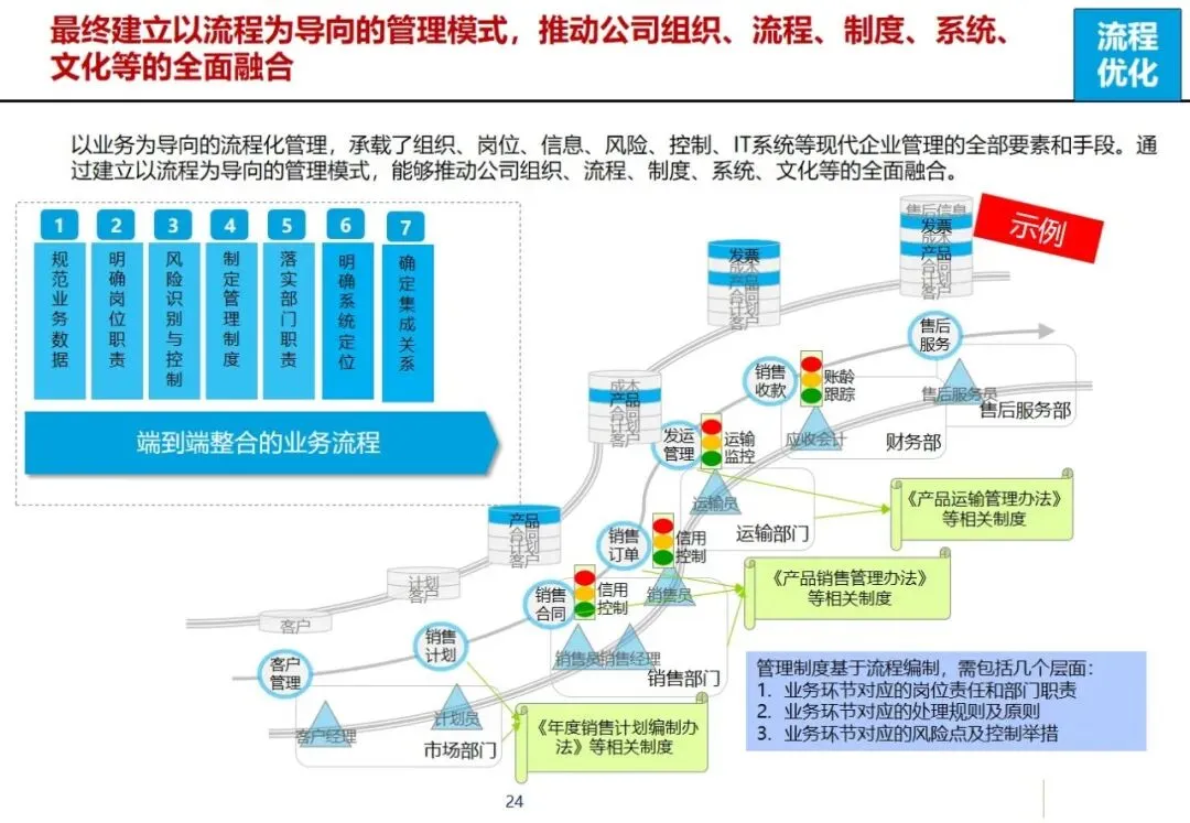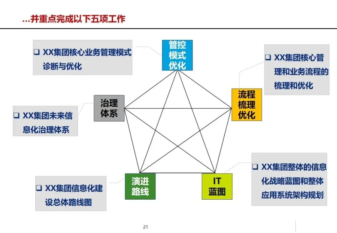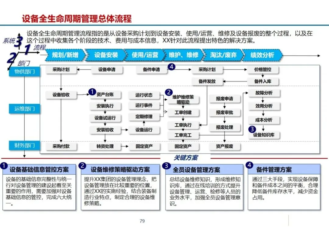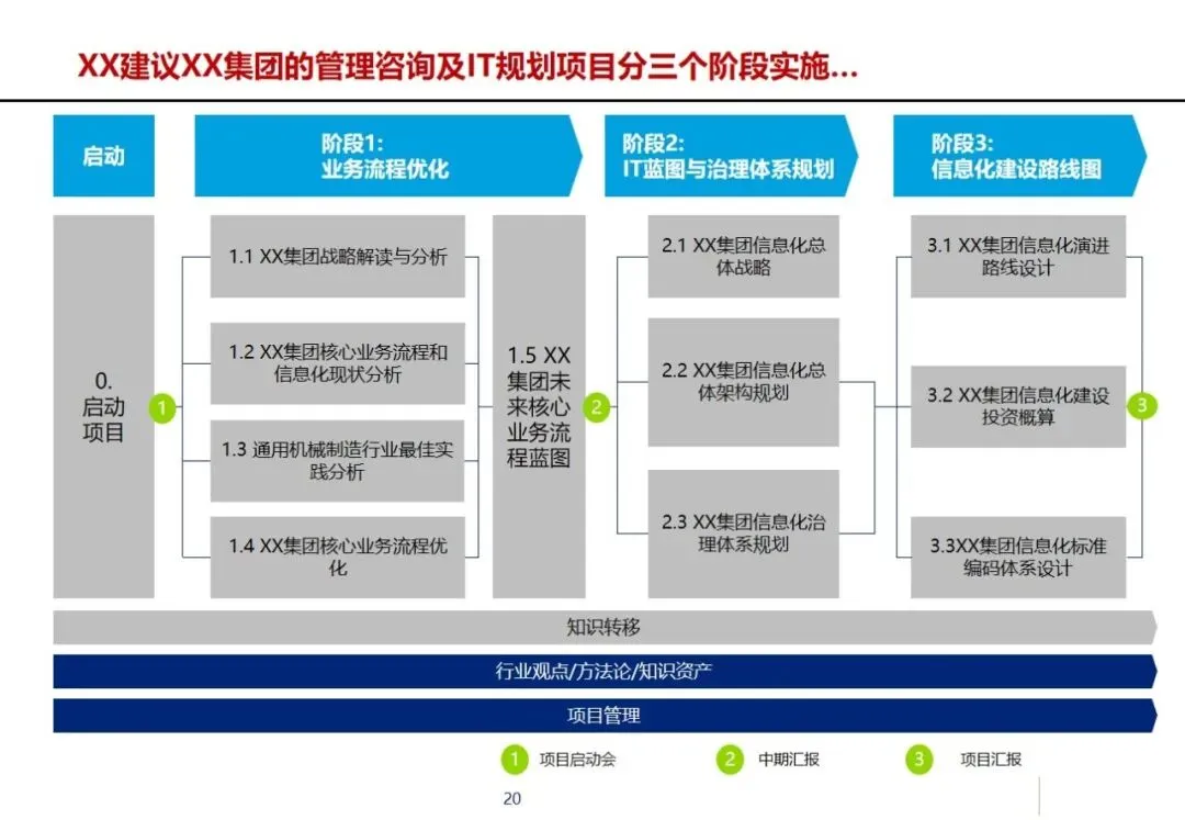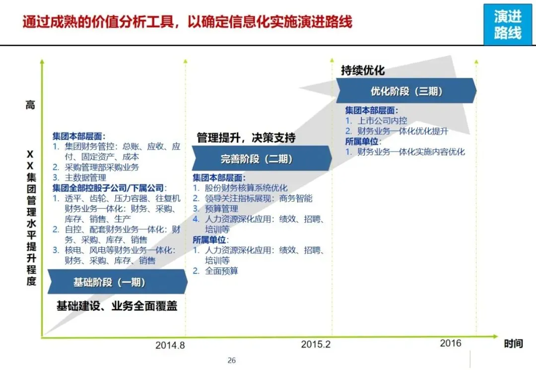 项目分为三个阶段,第一阶段以优化核心业务流程为重点,结合行业最佳实践经验,梳理出面向客户的标准化、流程化的业务流程蓝图;第二阶段,完成企业信息化体系结构和管理体系的规划,构建PDM、ERP、MES等8个信息系统的一体化体系结构,形成“统一管理、统一控制、分而治之”的企业信息化管理控制体系;第三阶段,制定信息化发展方向和标准代码制度,分三个阶段实施,即基础阶段、完善阶段和优化阶段。
