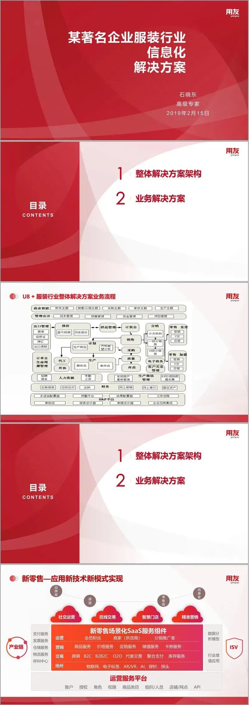 本文旨在深度剖析由高级专家石晓东于2019年2月发布的《某著名企业服装行业信息化解决方案》。该方案是一份针对服装行业的综合性数字化蓝图,其核心思想在于通过“U8+”产品体系,深度融合新兴技术,构建一个覆盖新零售、智能制造、供应链协同及精细化管理的全方位信息化平台,以助力服装企业应对市场挑战,实现转型升级。