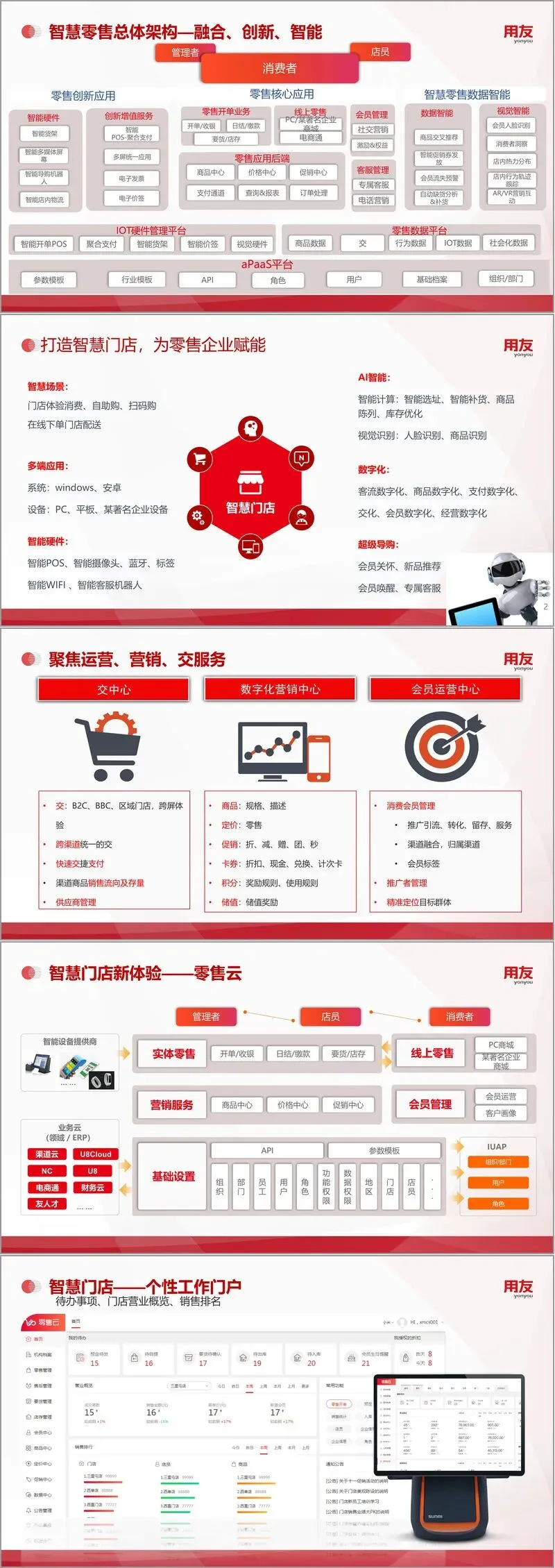 在前端,方案详细描绘了“智慧门店”的新体验。通过智能POS、聚合支付、自由购(扫码自助购物)、代客下单、到店扫码支付等功能,极大提升了顾客购物的便捷性。同时,借助AI视觉识别(如人脸识别、商品识别)、智能货架、电子价签、智能WIFI等物联网硬件,门店实现了客流、商品、支付、会员、经营的全面数字化。这使得门店能够进行会员人脸识别、店内热力分布分析、顾客行为轨迹跟踪,从而为精准营销和优化陈列提供数据支持。