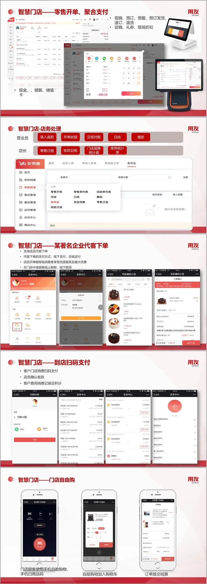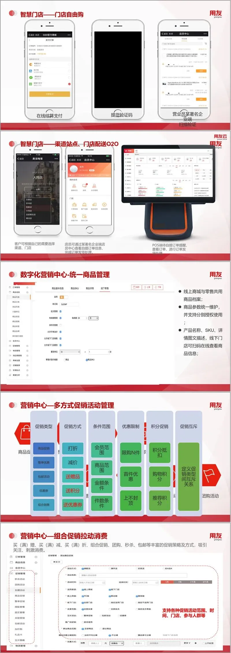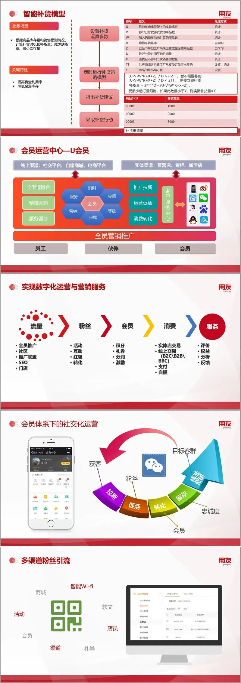在后端,方案提出了“数字化营销中心”和“会员运营中心”的概念。统一商品管理确保了线上线下商品信息的一致性与同步。营销中心支持包括买赠、满减、折扣、团购、秒杀、优惠券等在内的多种灵活促销方式,并可实现按产品SKU、会员等级等多维度定价。会员运营中心(U会员)则致力于构建全渠道融合的会员体系,通过积分、礼券、储值、社交互动(如直播、游戏、红包、口碑分销)等方式,完成从粉丝引流、拉新获客到消费转化、服务留存的完整会员生命周期管理,实现精准营销与会员忠诚度提升。