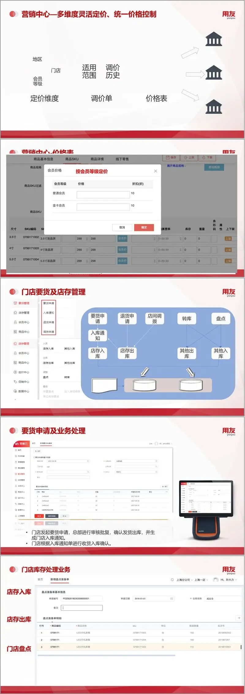 针对企业与经销商、加盟商之间的业务协同,方案重点推出了“U订货”解决方案。这是一个企业级的专属B2B订货平台,旨在改变传统依赖订货会的低效模式。分销商、经销商可通过电脑、PAD、手机APP等多种终端,自助完成商品浏览、下单、支付等操作。该平台与后端ERP系统(如NC、U8/U9)无缝集成,实现了订单、库存、资金流的实时同步,支持后续的订单跟踪和财务对账。U订货不仅提升了订货效率,加快了产品上新与换代的速度,还为企业拓展多品类销售、增强客户粘性提供了有力工具。