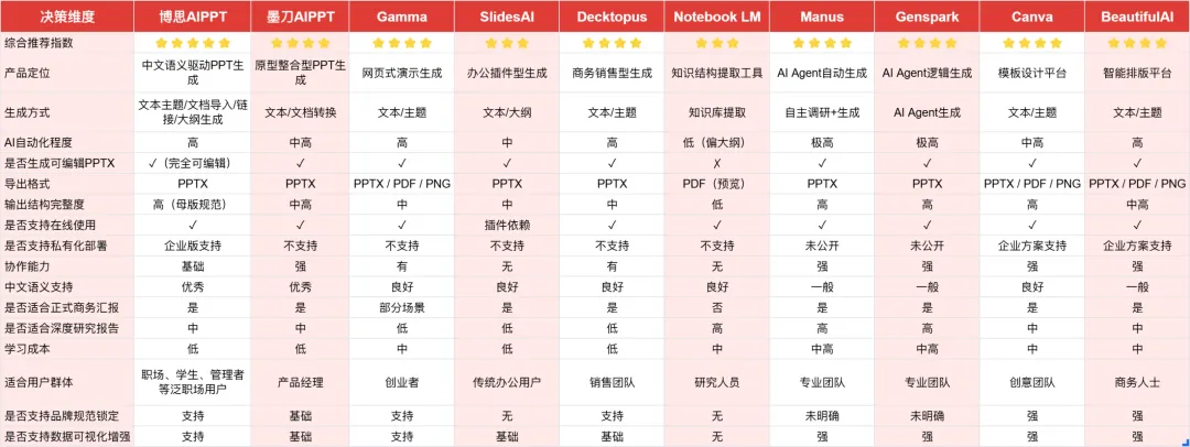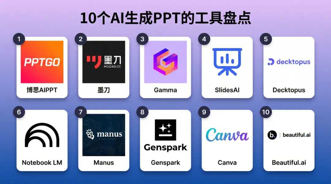 AI技术正在深刻改变PPT制作的方式。从最初简单的模板套用,到现在智能的内容生成、自动化设计、协同编辑,技术进步让原本耗时费力的工作变得高效便捷。这10款生成PPT的AI工具各有特色:博思AIPPT和墨刀AIPPT深耕国内市场,中文体验优秀;Gamma和SlidesAI注重速度和易用性,适合快节奏工作;Decktopus和BeautifulAI强调设计专业性,满足高质量呈现需求;NotebookLM、Manus和Genspark突破了传统PPT工具的边界,将内容生成能力推向新高度;Canva则以海量资源和全能设计能力成为综合性首选。选择哪款工具,取决于你的具体需求。追求效率,在意中文体验选博思AIPPT或墨刀AIPPT,重视设计选Canva或BeautifulAI,需要深度内容选Manus或Genspark,预算有限选SlidesAI。很多时候,组合使用多个工具能达到最佳效果,比如用NotebookLM整理内容,再用博思AIPPT生成设计,这种内容+设计的分工协作往往事半功倍。善用这些AI工具,把时间和精力投入到真正重要的内容构思上,你会发现制作PPT不再是负担,而是一个高效表达想法的过程。以上就是本次想和各位分享的所有内容,希望能帮到有需要的朋友。如果你有其他疑问,或是想进一步了解的内容,欢迎在下方的评论区留言,我们一起交流探讨。