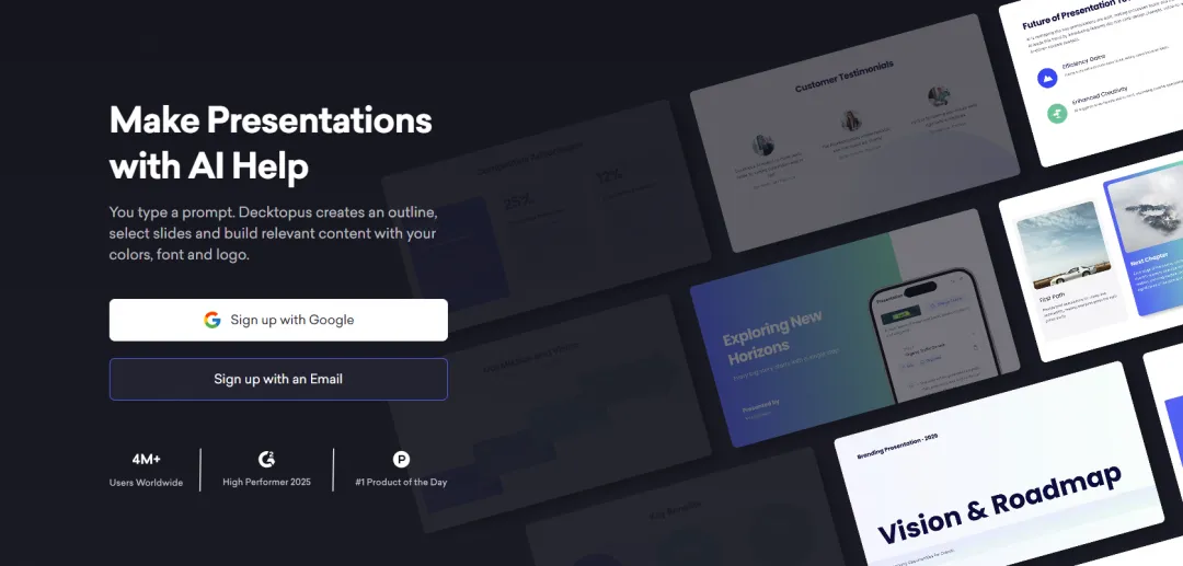 核心定位:专为Google Slides打造的AI生成插件,无缝集成到Google办公套件中。文本转幻灯片效率高SlidesAI特别擅长处理大段文字内容。当你粘贴一篇文章或会议记录时,插件会自动分析段落结构,将要点提取为独立页面。每页保留核心观点,去除冗余信息,确保幻灯片内容简洁明了。引用来源标注清晰在学术演示和研究报告场景中,SlidesAI支持自动标注内容来源。如果生成的幻灯片引用了某份文档或网页的信息,会在页面底部添加引用说明,符合学术规范要求。免费额度友好相比其他AI生成PPT工具,SlidesAI提供的免费额度更加慷慨。免费用户每月可以生成10份演示文稿,每份最多30页,对于个人用户和小团队来说基本够用。付费版本也比同类产品便宜,性价比突出。05 Decktopus