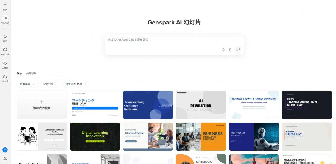 核心定位:AI Agent驱动的智能演示生成平台,能够从主题输入到完整幻灯片输出实现全流程自动化。自主调研能力强大当你输入一个主题后,Manus不是简单地基于模板生成内容,而是会主动在互联网上检索相关信息。比如要求制作人工智能在医疗领域的应用演示,Manus会搜索最新的研究报告、行业新闻、案例数据,然后整合成演示内容,信息时效性和准确性都有保障。逻辑规划自动化Manus具备较强的内容组织能力,能够根据演示目的规划合理的逻辑结构。制作产品发布PPT时,会自动安排痛点介绍→解决方案→功能亮点→竞品对比→定价策略这样的经典流程;制作学术汇报时,则会采用研究背景→方法论→实验结果→讨论→结论的学术范式。图表生成质量高Manus内置了专业的数据可视化引擎,能够根据数据特征自动选择合适的图表类型,并进行美化处理。生成的图表不仅数据准确,配色、标注、图例等细节也都符合专业标准,直接使用无需修改。多语言内容生成Manus支持同时生成中英文版本的演示文稿,两个版本的内容对应,但会根据不同语言的表达习惯进行调整。这对于需要面向国际听众的演讲者来说非常实用,避免了机械翻译的生硬感。持续学习能力Manus会记录你的使用偏好,包括喜欢的设计风格、常用的内容结构、行业术语等。使用次数越多,生成的演示文稿越贴合你的个人风格,减少了后期调整的工作量。08 Genspark