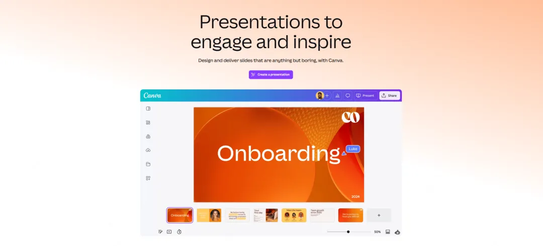 这类工具原本专注于设计领域,后来扩展了PPT生成功能。它们的优势在于强大的视觉设计能力和丰富的素材资源。09 Canva(Magic Design/AI Presentations)