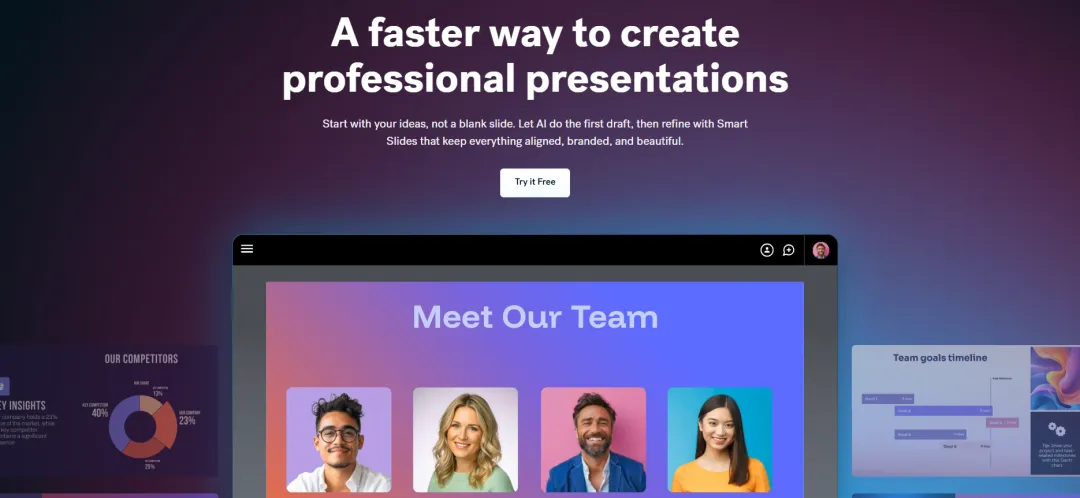 核心定位:全球知名的在线设计平台,通过AI功能实现幻灯片的快速生成和智能美化。模板数量海量Canva提供了超过100,000套演示文稿模板,覆盖几乎所有行业和场景。从简约商务风到活泼卡通风,从学术严谨风到时尚潮流风,总能找到符合需求的设计方案。每套模板都经过专业设计师打磨,质量有保证。Magic Design智能生成Canva的AI功能Magic Design可以根据你输入的主题和内容,自动选择合适的模板,填充文字和图片,生成完整的幻灯片。整个过程只需几次点击,即使完全不懂设计也能做出精美的PPT。素材库资源丰富Canva内置了数百万张高清图片、插画、图标、视频素材,大部分可以免费使用。在制作PPT时,可以直接在编辑器内搜索和插入素材,无需到其他平台下载,大幅提升了效率。品牌套件功能对于企业用户,Canva支持创建品牌套件,预设企业的标准色、字体、Logo等视觉元素。使用AI生成PPT时,系统会自动应用品牌套件中的设置,确保所有演示文稿都符合企业VI规范,保持视觉一致性。协作与分享便捷Canva支持团队协作编辑,多人可以同时在线修改同一份PPT。完成后可以一键生成分享链接,或者直接下载为.pptx、PDF等格式。Canva还提供了演示模式,可以在浏览器中直接播放幻灯片,无需安装任何软件。动画效果预设丰富Canva内置了大量精美的页面切换动画和元素动画效果。你可以为整个演示设置统一的动画风格,也可以为单独的元素添加特效。这些动画效果专业且不俗气,能够有效提升演示的吸引力。10 BeautifulAI