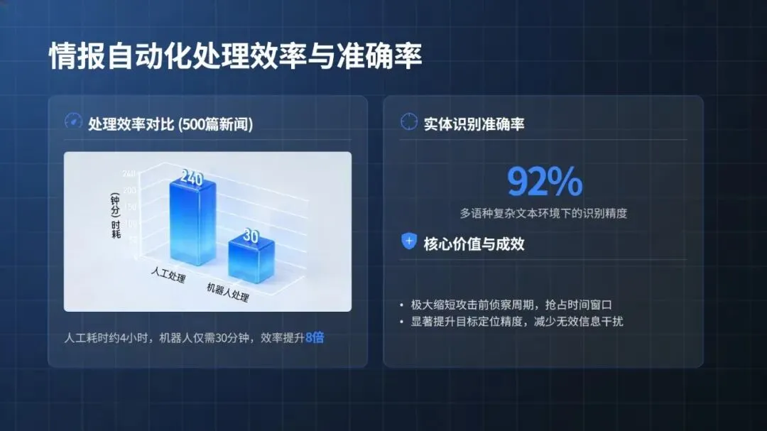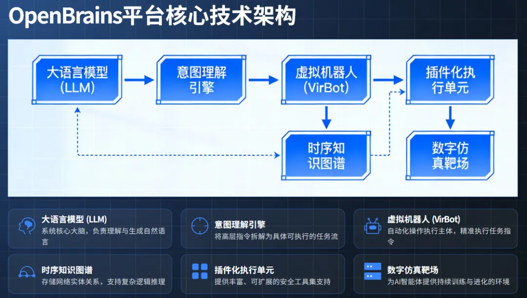 在技术架构上, OpenBrains平台的核心是大语言模型,该平台将虚拟机器人、时序知识图和插件工具链结合在一起,能够进行自然语言的交互和复杂任务的分解。在多语言信息处理的情况下,该系统能够对世界范围的新闻进行自动采集、翻译、归纳和实体标识,在30分钟的时间内可以处理500多条新闻,实体标识的正确率达到92%,大大提高了信息检索的效率。