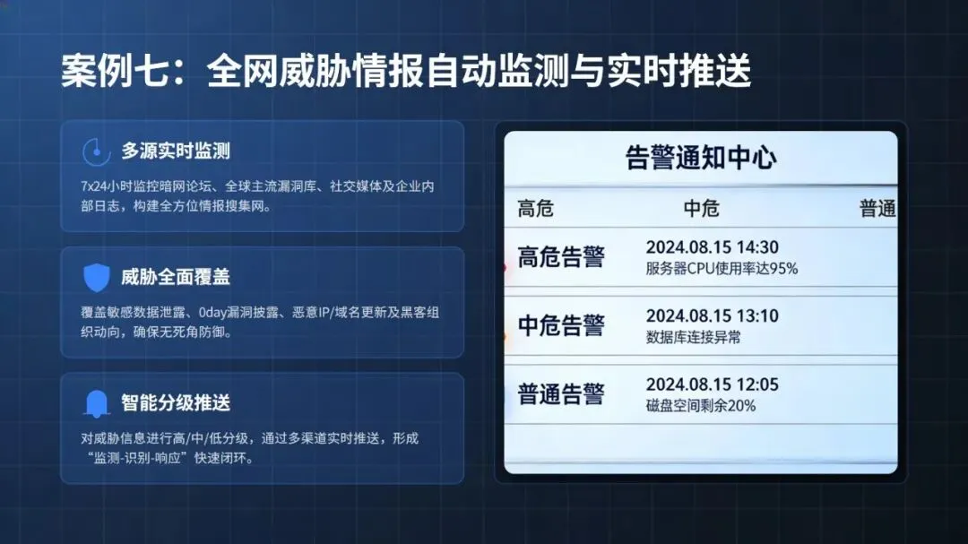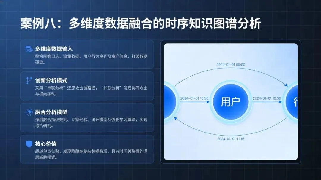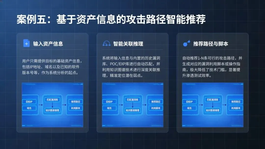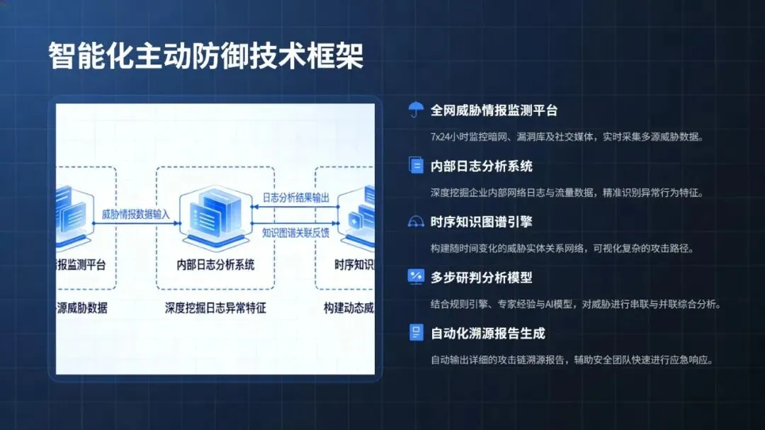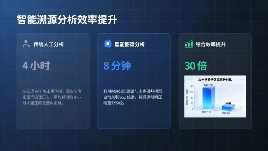 在实战应用中,在攻击仿真领域,建立了从识别目标、触发语义任务到推荐攻击路径的自动化流程,实现了上千个动作单元和数十个流程模板的集成,实现了复杂作战任务的自动调度和执行。主动防御方面,通过对网络的威胁情报监控和基于时间序列的知识图谱的追踪,可以将整个攻击链的分析时间由原来的4个小时缩短到8分钟,提高了30倍的应急响应效率。
