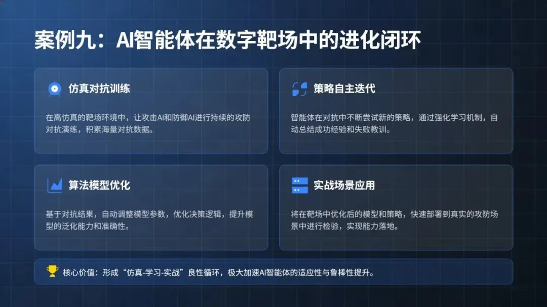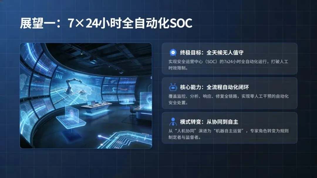 为了加快 Agent的进化速度,论文提出了建立多维数字模拟靶场的设想,并在攻防演练中不断进行策略的迭代和模型的优化,从而形成“模拟—学习—实战”的闭环能力提升模式。未来的安全运作将会朝向全自动化 SOC的方向发展,攻击 AI与防御 AI之间的动态对抗将会成为常态,而决策的透明度与遵从性则需要透过可信 AI技术来确保。
