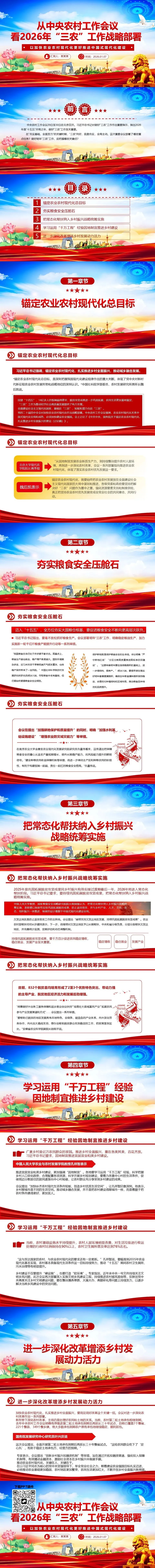 这份解读 2026 年 “三农” 工作战略部署的 PPT 亮点突出,兼具专业性、逻辑性与实用性,是优质的政策解读类汇报材料。其一,结构规整清晰,采用 “前言 + 五大核心章节” 的框架,目录明确划分锚定总目标、夯实粮食安全、常态化帮扶、乡村建设、深化改革五大板块,内容层层递进,从顶层目标到具体落地举措,逻辑链条完整,契合汇报类 PPT 的表达逻辑,便于受众快速把握核心脉络。其二,内容权威且贴合政策,紧扣中央农村工作会议精神与习近平总书记关于 “三农” 工作的重要指示,立足 2026 年 “十五五” 开局的关键背景,政策导向明确,时效性强,核心部署解读精准,牢牢围绕农业农村现代化主线展开。其三,理论与实践深度融合,既融入社科院、北大、人大等院校专家的专业解读,也结合农业农村部工作部署与实际数据,还提及脱贫县主导产业、农村人居环境等现实成果,让政策解读既有理论支撑,又有实践落地性,避免内容空泛。其四,重点突出、凝练简洁,各章节聚焦核心任务,提炼关键举措与核心观点,文字表述删繁就简,贴合 PPT 可视化汇报的特点,每一部分均紧扣 “推进乡村全面振兴、服务中国式现代化” 的核心立意,主题鲜明且首尾呼应,形成完整的内容闭环。