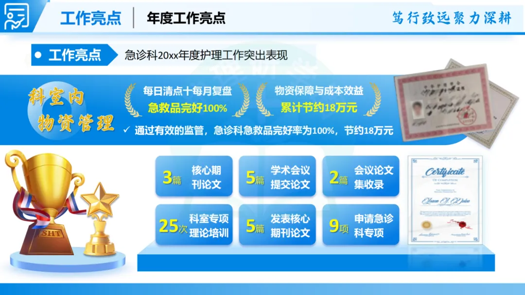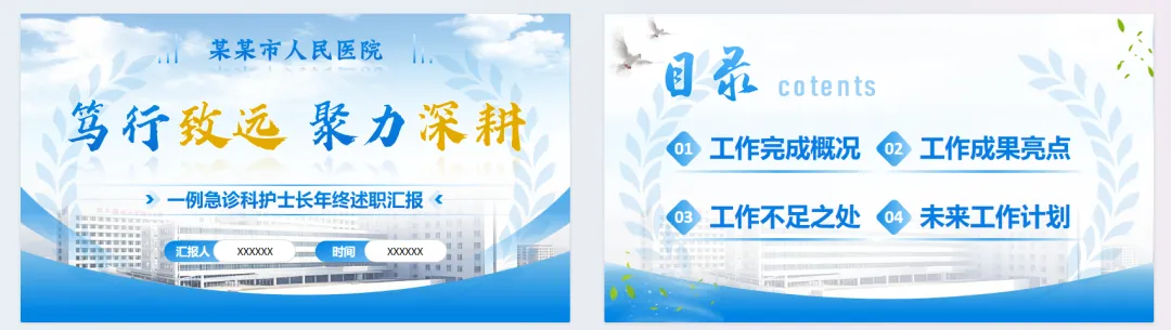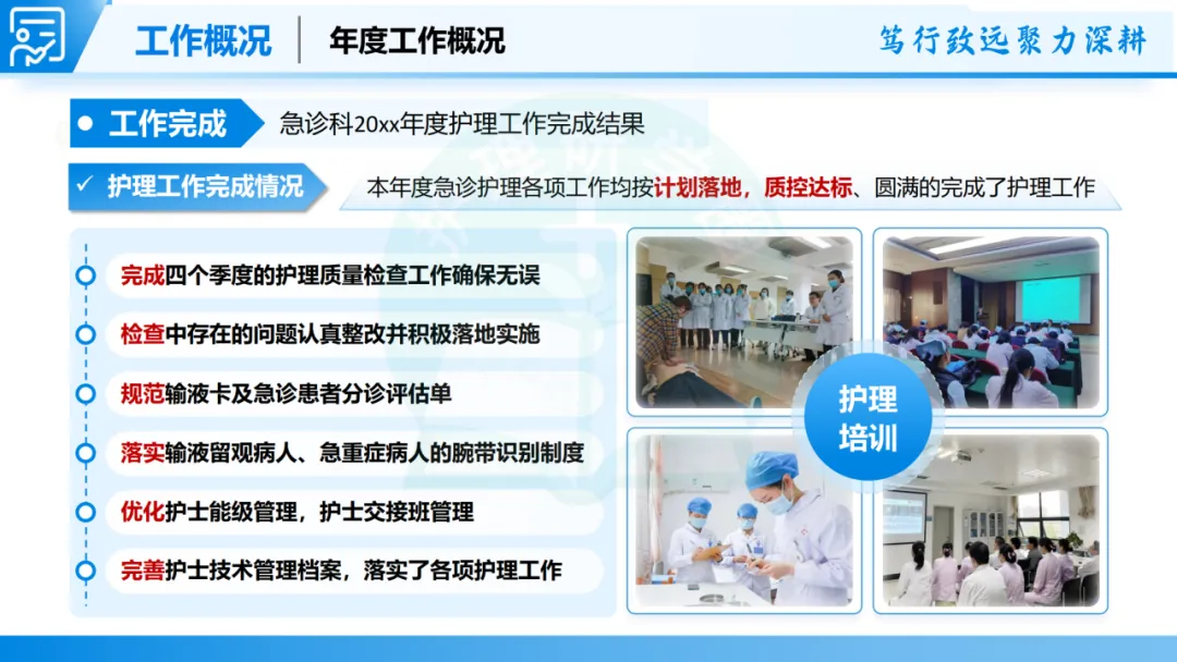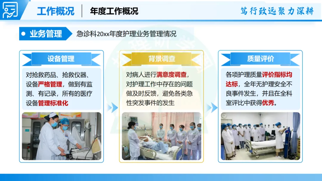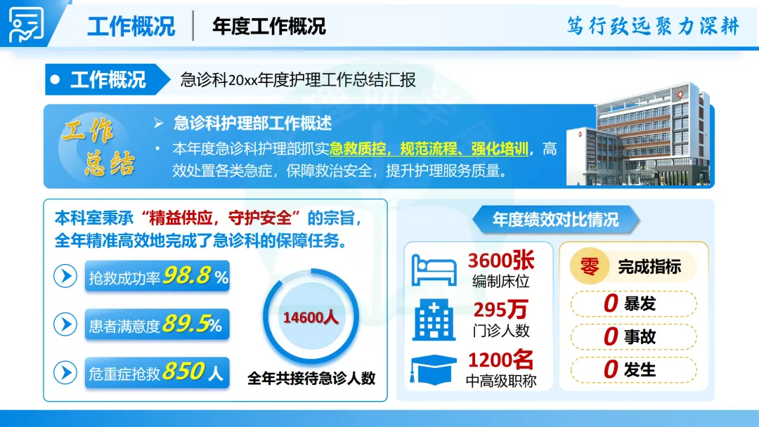一例急诊科护士长年终述职汇报这样的渐变高级蓝PPT设计标准且具有专业性的PPT。