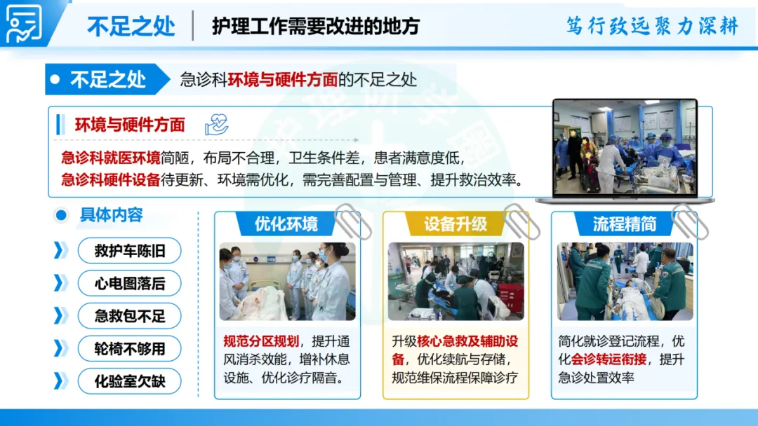 环境与硬件方面:急诊科环境简陋、布局不合理、卫生条件差,患者满意度低。硬件设备老化,需更新优化,提升救治效率。