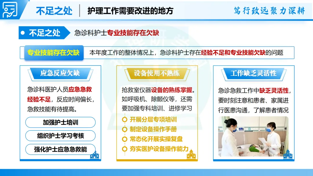专业技能方面:护士经验不足,应急反应时间偏长,急救技能需加强🍀。设备操作(如呼吸机、除颤仪)不熟练,需专项培训。工作中缺乏⚔灵活性,医患沟通与应变能力有待提升。