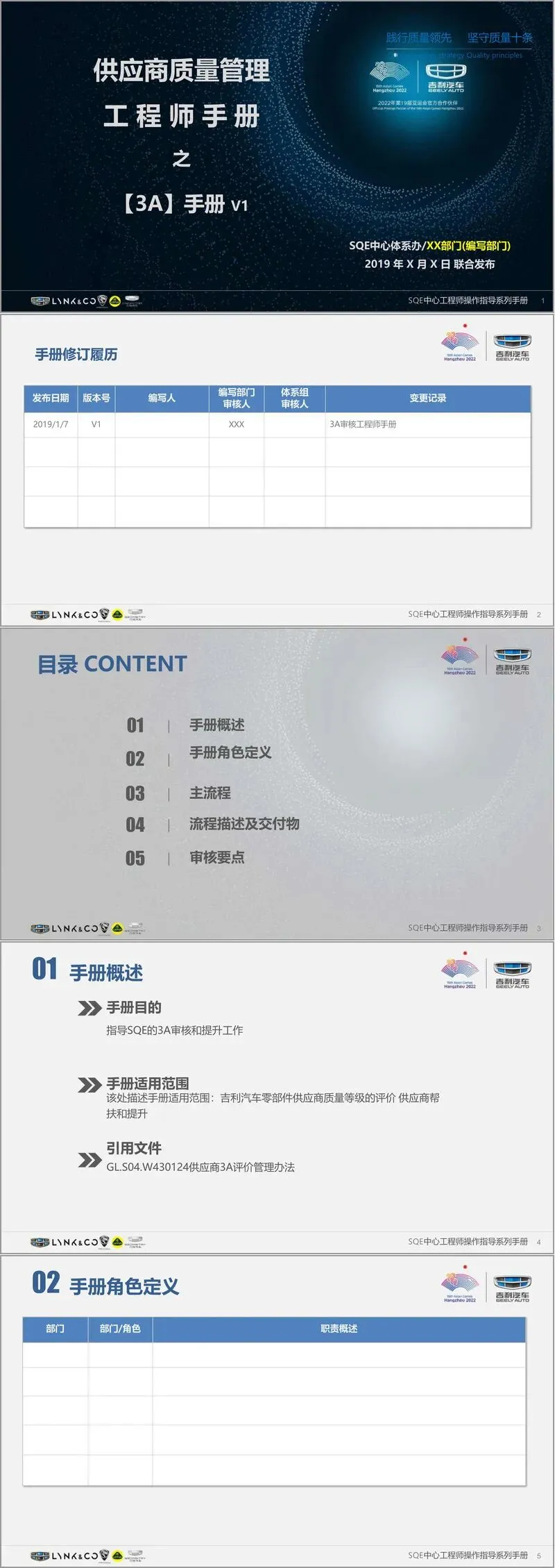 本手册由吉利汽车 SQE 中心体系办等部门联合发布,是 SQE 工程师开展供应商 3A 审核与提升工作的核心指导文件,适用于吉利汽车零部件供应商质量等级评价及帮扶提升工作,引用《供应商 3A 评价管理办法》作为核心依据。