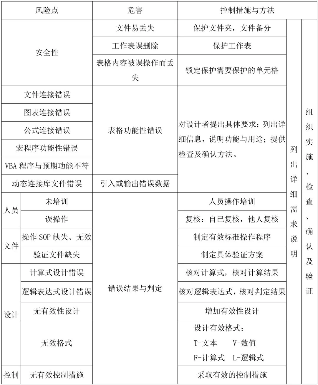 分别在应用与设计阶段采用有效的预防与控制措施对风险进行实际控制。下表提供部分控制措施与方法。更多的控制方式与接受方式以文件形式列出。(需求说明、操作SOP、验证方案)