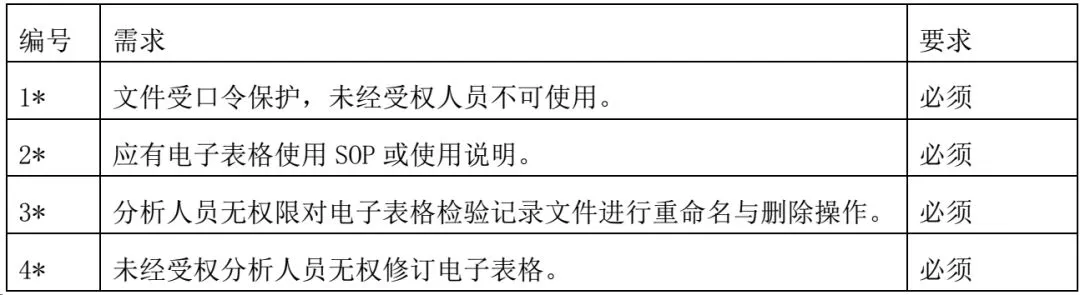 常规的电子表格记录存在风险,为保证电子表格从设计到应用的整个过程均准确、可靠、安全、有效,对电子表格检验记录加以风险控制并提出如下要求(*项目与风险控制相关)。