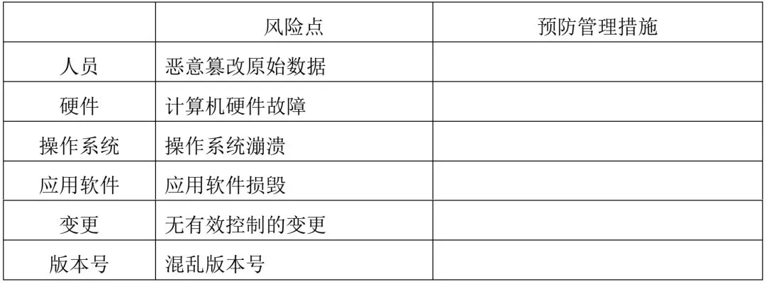 通过对电子表格的常用情况调查分析.认定能够影响常规电子表格的安全性、有效性、准确性及完整性的因素可视为风险。如下表所示: