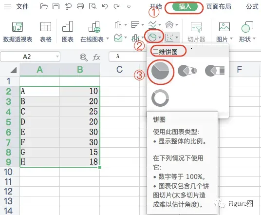 2.选中数据,依次点击“插入”→“饼图”→“二维饼图”→“饼图”,插入图表。