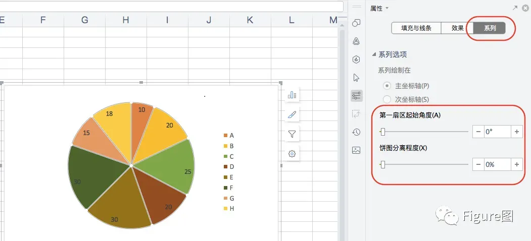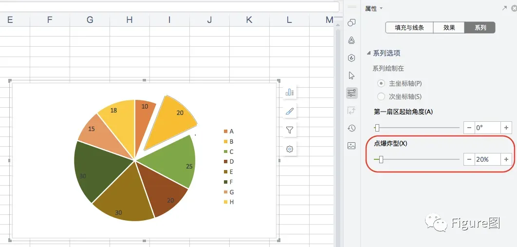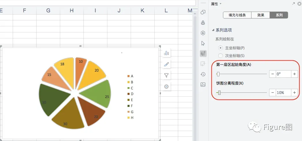 11.当我们通过调整饼图的分离程度,可以看到不同的系列围绕着饼图的圆心分别向不同角度分散。