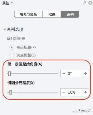 10.首先是整体的分散图,我们选中整个饼图,在“属性”→“系列”→“系列选择项”→“饼图分离程度”中可以看到目前相互之间的分离程度为0,也就是各部分之间均未分离。