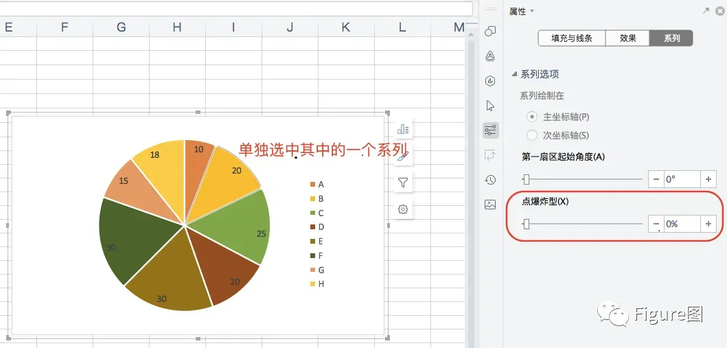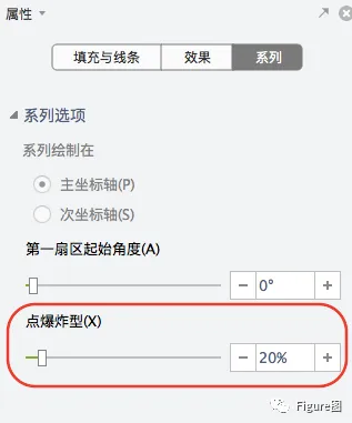 12.接下来是单独的一个或者几个系列与整体的分离饼图。这里就要选中需要分离出去的系列,在“属性”→“系列”→“系列选择项”中已经是“点爆炸型”了,通过这个数值,便可以将单个的系列分离(如图所示)。