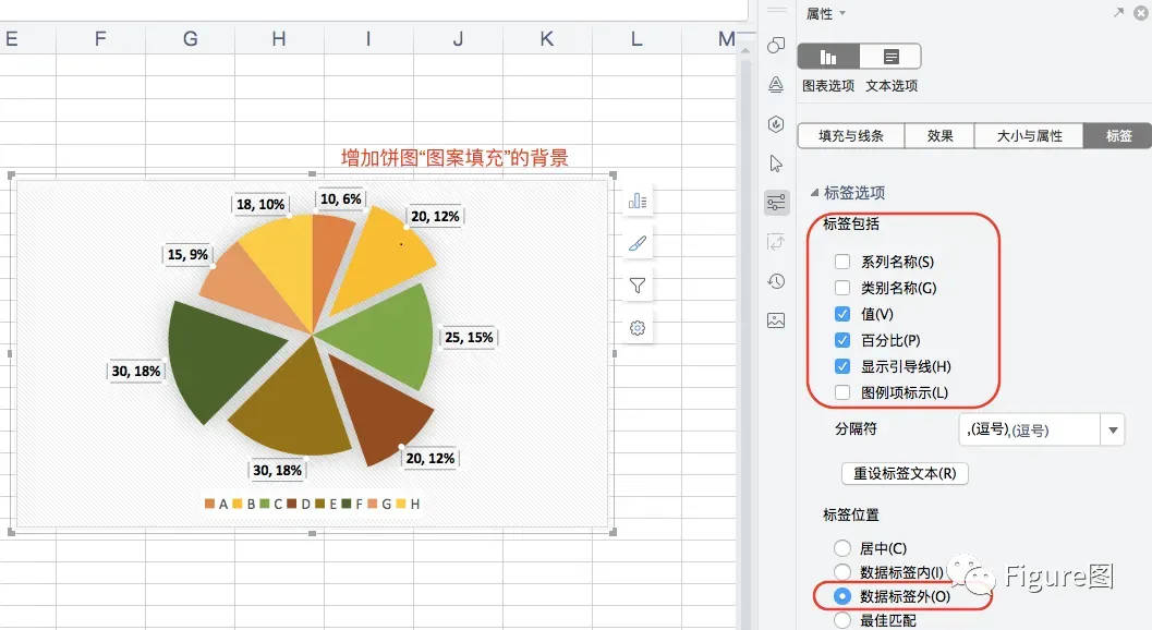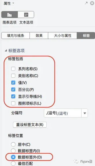 14. 有些小伙伴可能会问那既然饼图是显示比例,如何直观看出它们的比例呢?我们直接选中标签后,通过“属性”→“标签”→“标签选项”→“标签包括”中把“百分比”勾选上,同时把“标签位置”调整为“数据标签外”。