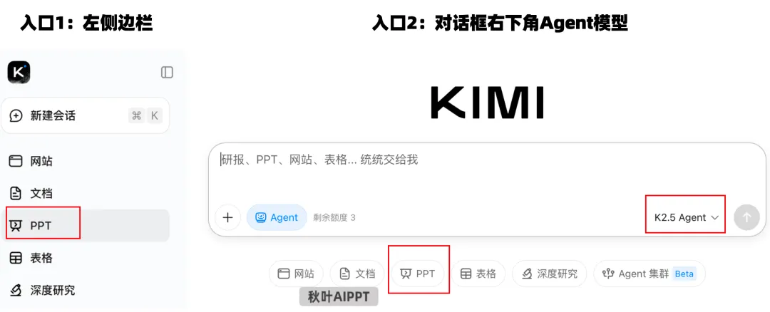 ✅操作方法也很简单:打开 Kimi,点击左侧的 PPT 助手功能;或者新建对话后,在对话框右下角选择 K2.5 Agent ,即可使用。