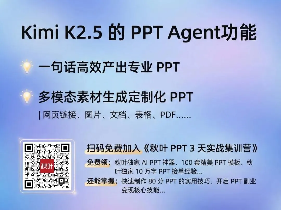 如果你想借助 AI ,把 PPT 做得更漂亮、更专业; 甚至想学会用 PPT 接单赚钱,开启副业之路……强烈推荐你来《秋叶 PPT 3 天实战集训营》!