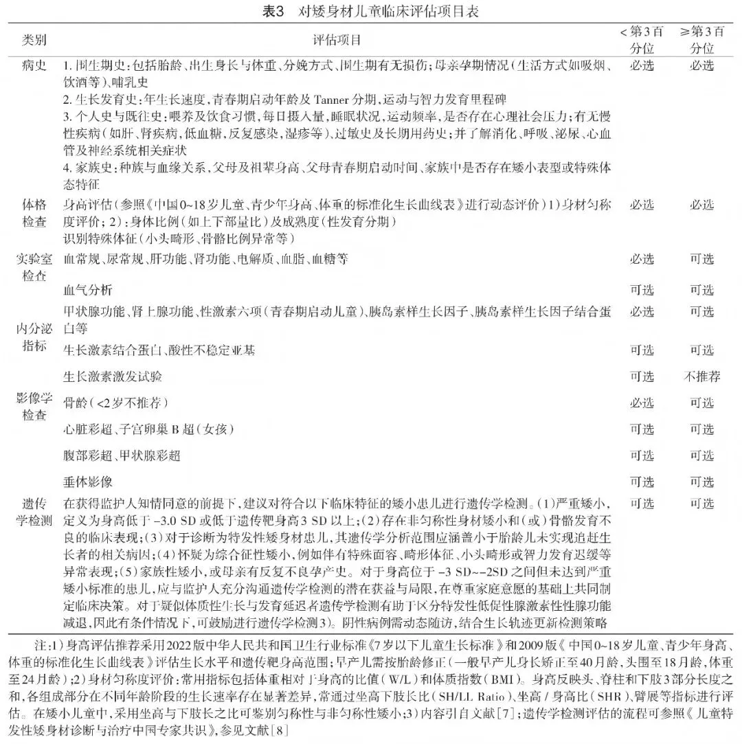临床评估:需进行全面评估(包括病史、体格检查等),并根据身高是否低于第3百分位数(P3)合理选择实验室、影像学及遗传学检查,避免不必要的检查。