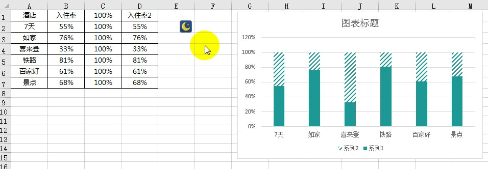 下面,我们需要将月亮小图标加在图表中,由于月亮小图标在图表的位置代表“入住率”,所以我们需要在图表中重复追加“入住率”数据,对应数据小编已经在表格中列出,即“入住率2”,之后通过改变图表类型将月亮小图标放置在图表中,下面我们进行具体操作,帮助你更好的理解。